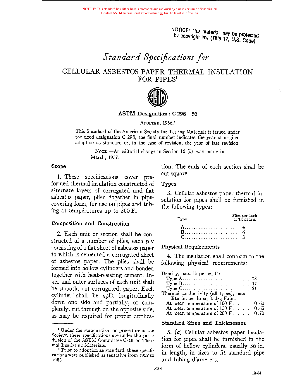 Specification for Cellular Asbestos Paper Thermal Insulation for Pipes (Withdrawn 1971)