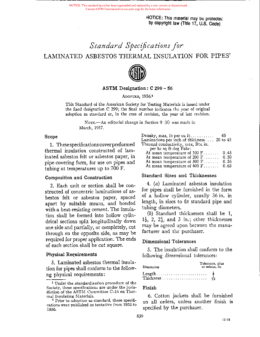 Specification for Laminated Asbestos Thermal Insulation for Pipes (Withdrawn 1971)