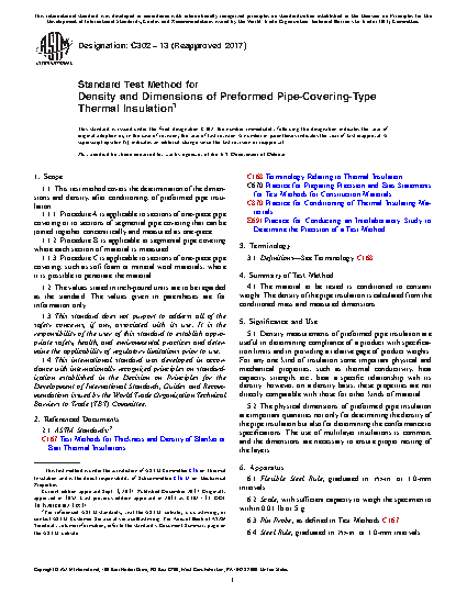 1.1 This test method covers the determination of the dimensions and density, after conditioning, of preformed pipe insulation.