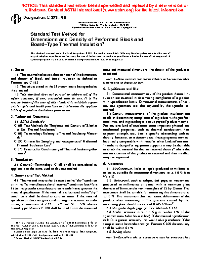 1.1 This test method covers determination of the dimensions and density of block and board insulation as defined in Terminology C168.