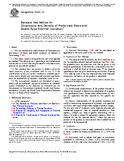 5.2 Density measurements of the product insulation are useful in determining compliance of a product with specification limits, and in providing a relative gage of product weights. For any one kind of insulation, some important physical and mechanical properties, such as thermal conductivity, heat capacity, strength, etc., bear a specific relationship with its density. In order to design for equipment supports, check the material for the “as received density” where the moisture content of the product as received and then installed may consequential.