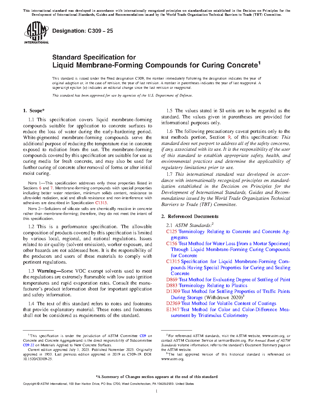 Note 1: This specification addresses only those properties listed in Sections 6 through 9. Membrane-forming compounds with special properties including better water retention, minimum solids content, resistance to ultraviolet radiation, acid and alkali resistance and non-interference with adhesives are described in Specification C1315.