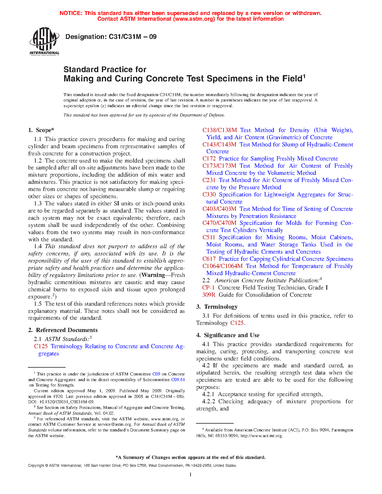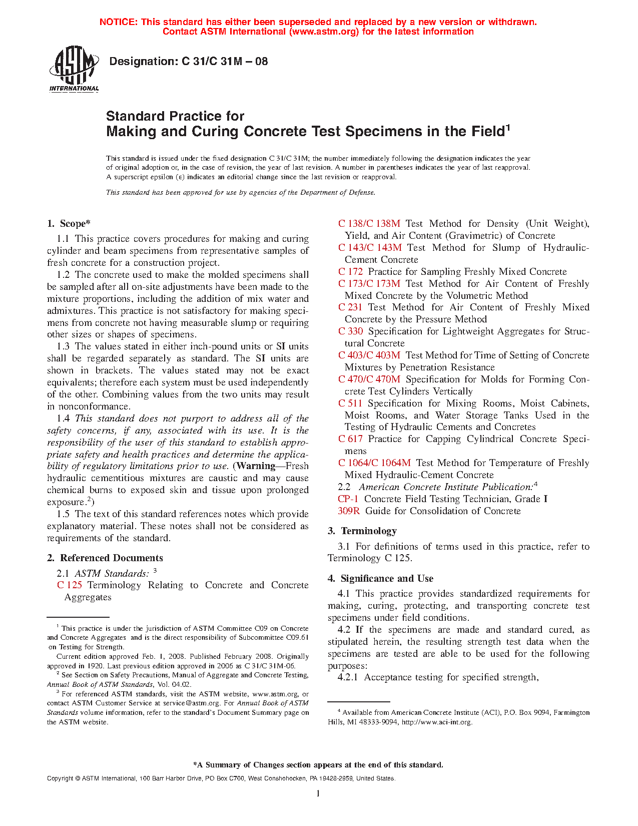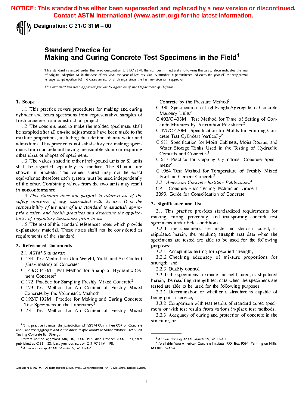 1.1 This practice covers procedures for making and curing cylinder and beam specimens from representative samples of fresh concrete for a construction project.