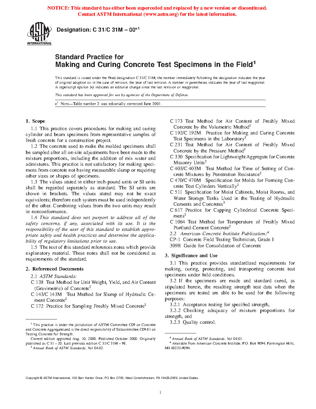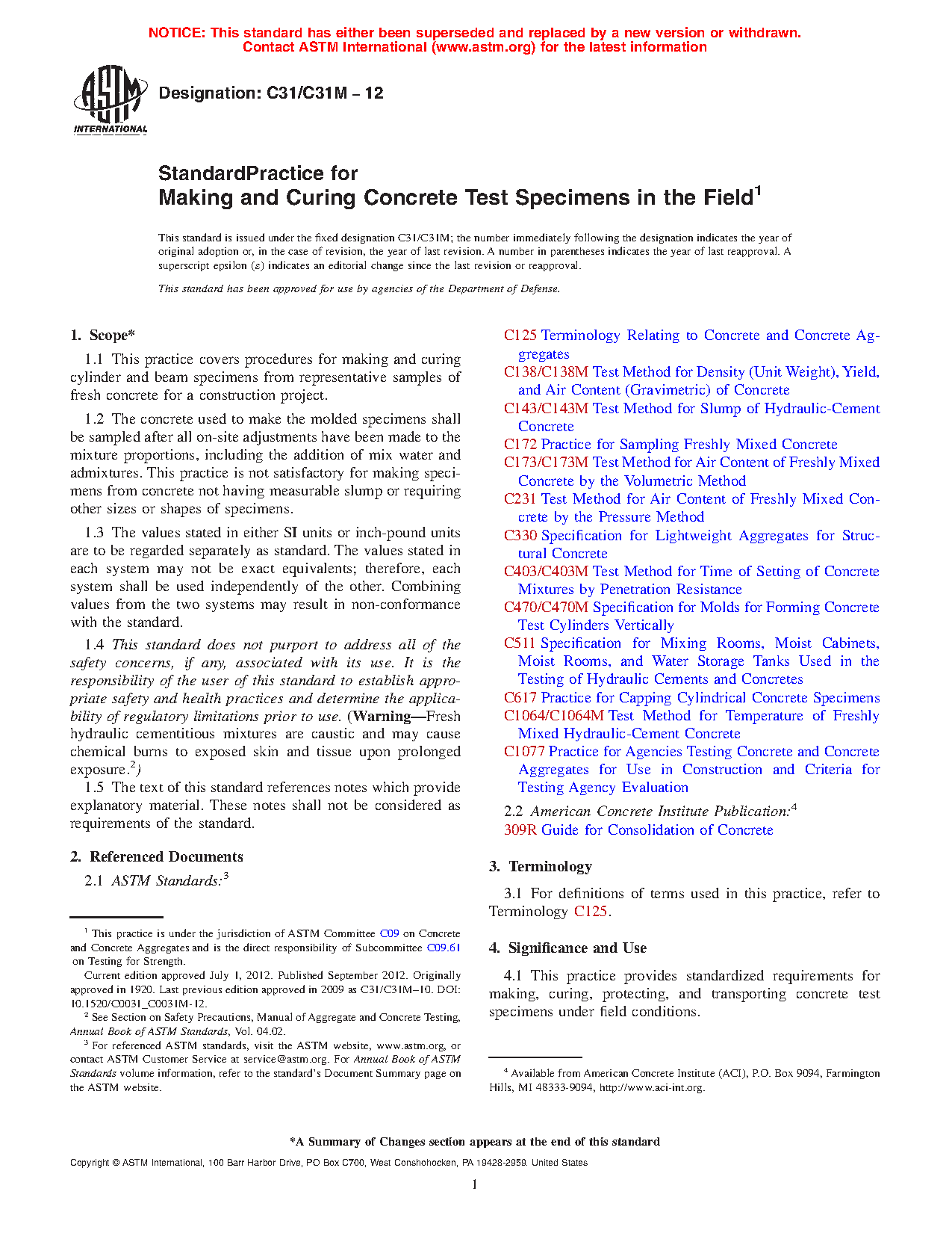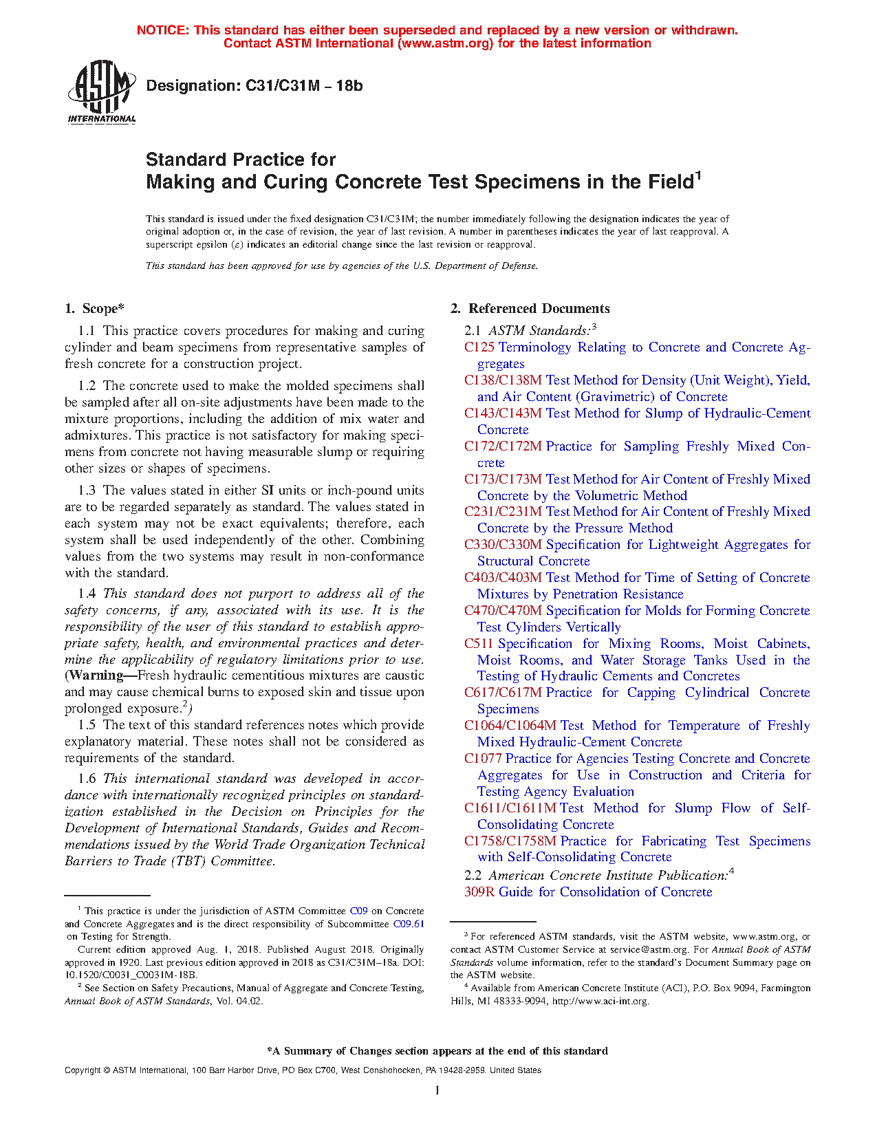 1.1 This practice covers procedures for making and curing cylinder and beam specimens from representative samples of fresh concrete for a construction project.