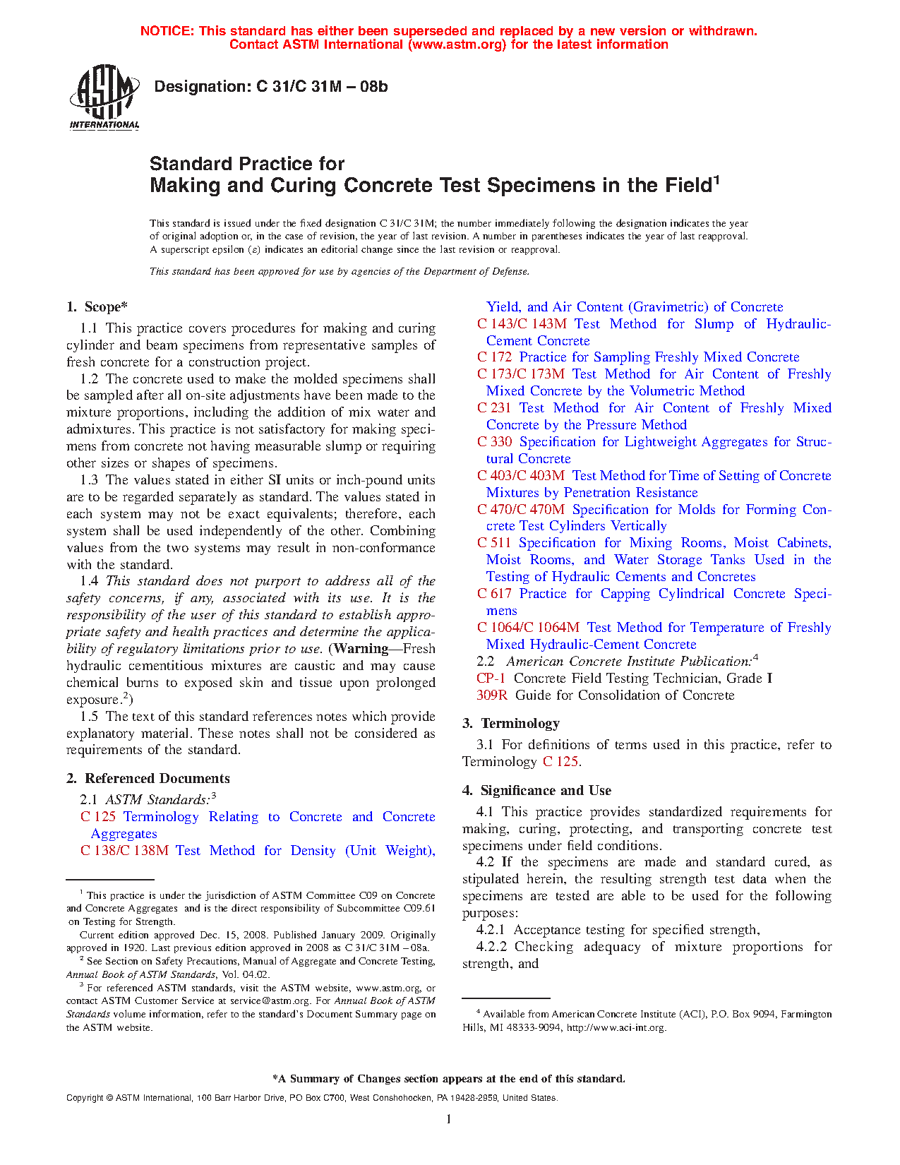 4.1 This practice provides standardized requirements for making, curing, protecting, and transporting concrete test specimens under field conditions.