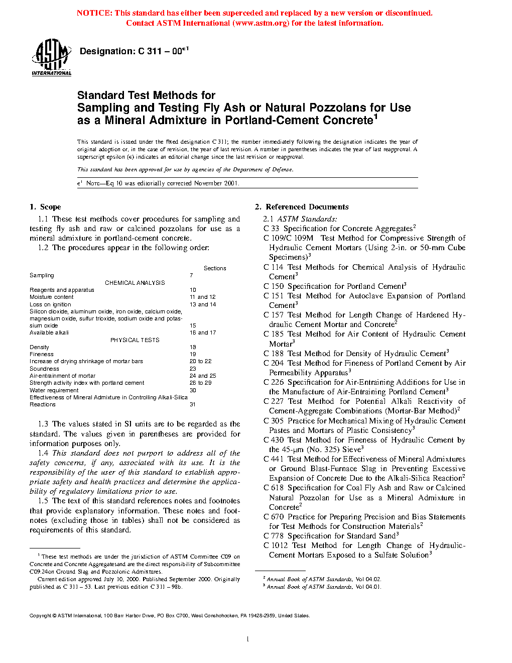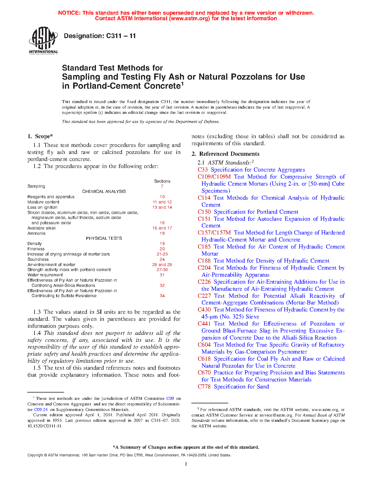 1.1 These test methods cover procedures for sampling and testing fly ash and raw or calcined pozzolans for use in portland-cement concrete.