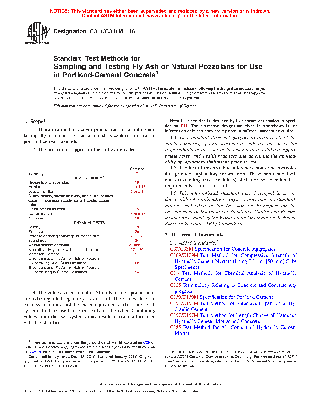 1.1 These test methods cover procedures for sampling and testing coal ash and raw or calcined pozzolans for use in concrete.
