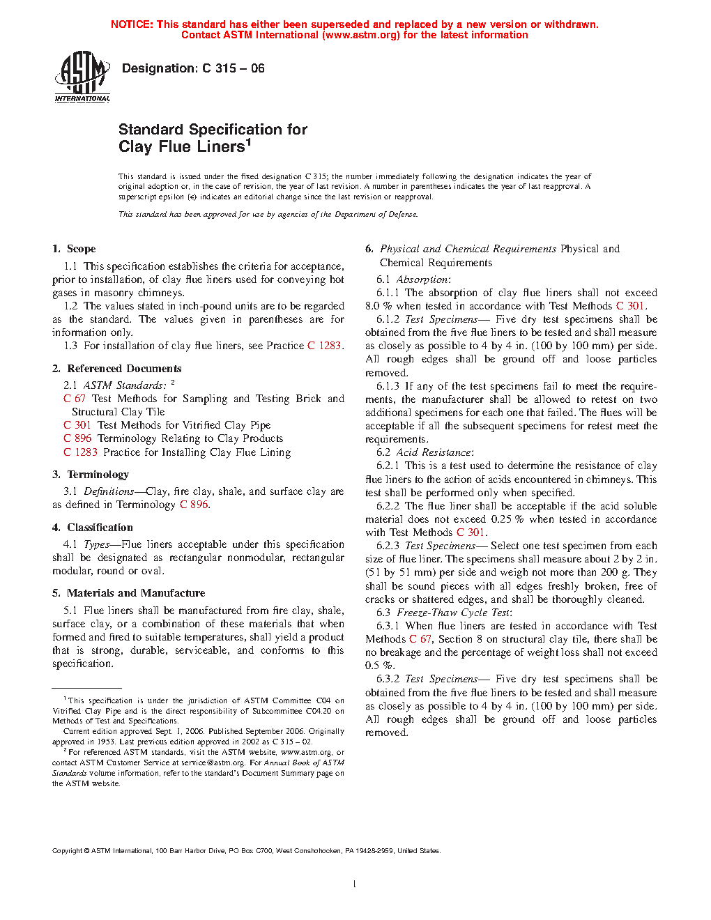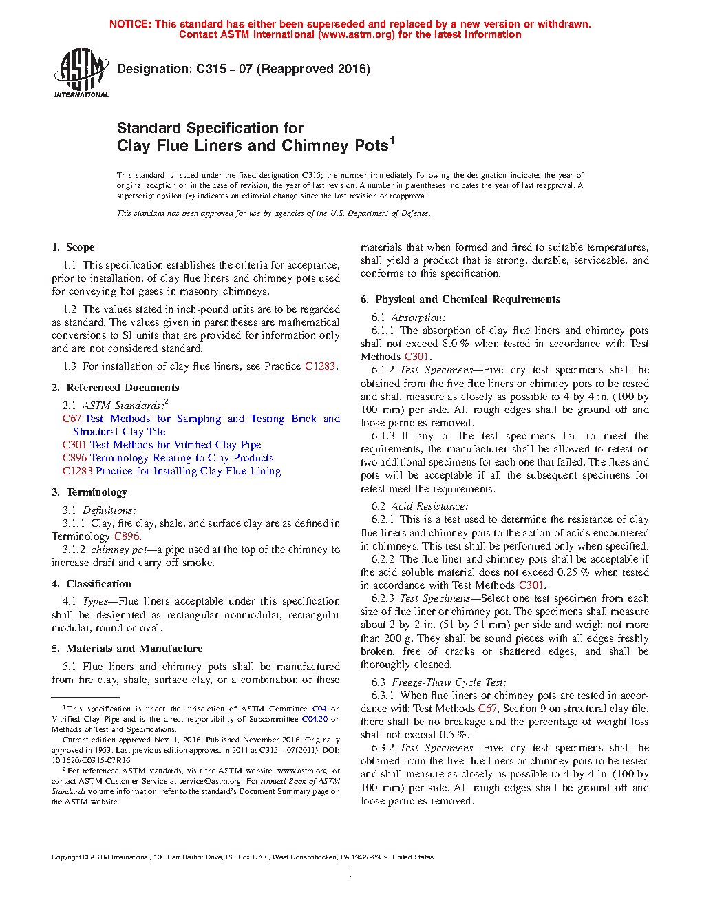 This specification establishes the criteria for acceptance, prior to installation, of clay flue liners and chimney pots used for conveying hot gases in masonry chimneys. The liners and pots shall be manufactured from fire clay, shale, surface clay, or a combination of these materials that when formed and fired to suitable temperatures, shall yield a product that is strong, durable, serviceable, and conforms to this specification. The liners and pots shall be subjected to absorption, acid resistance, and freeze-thaw cycle tests.