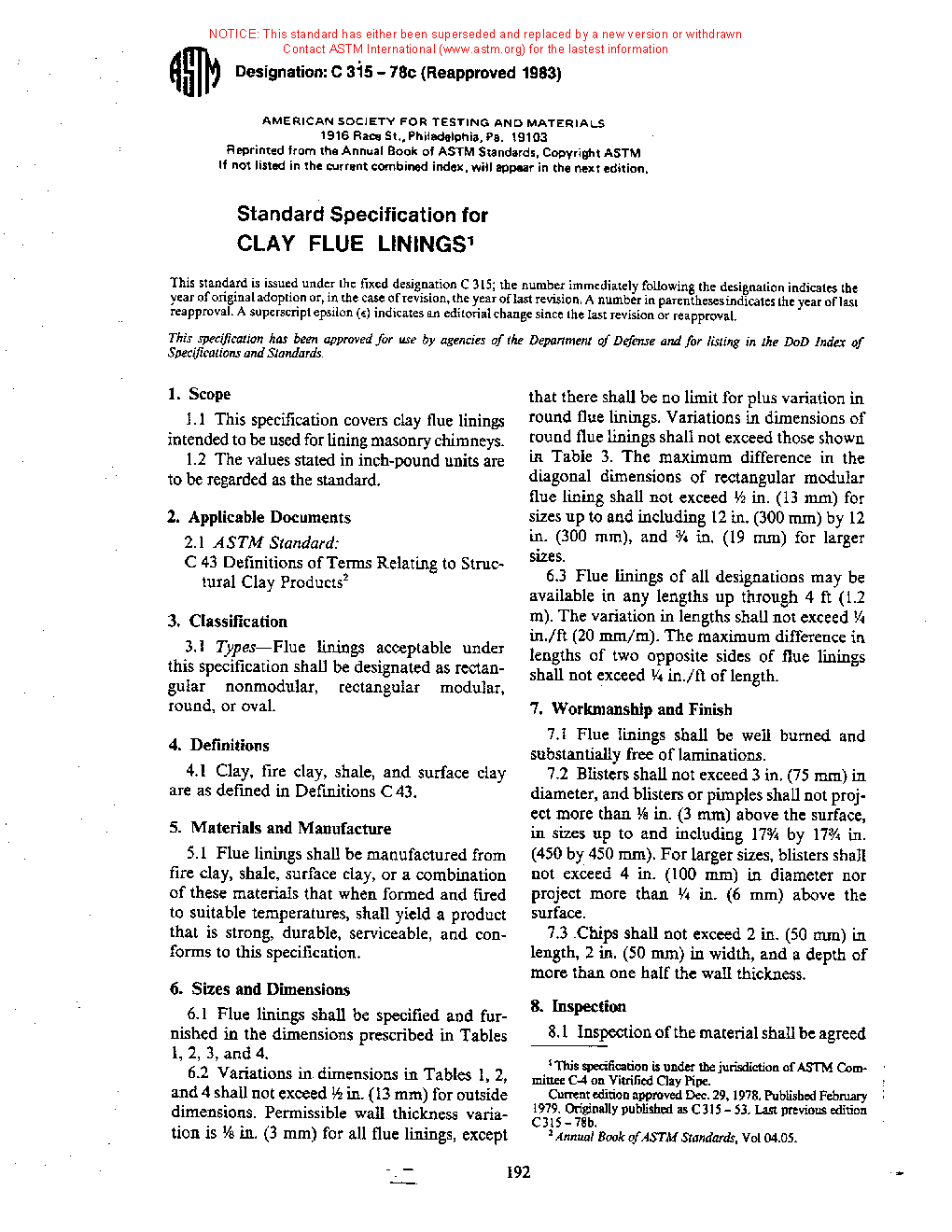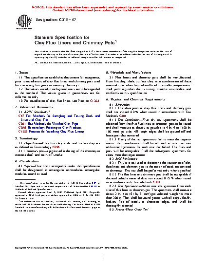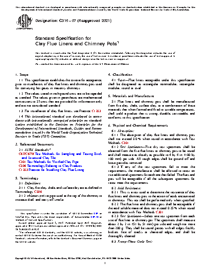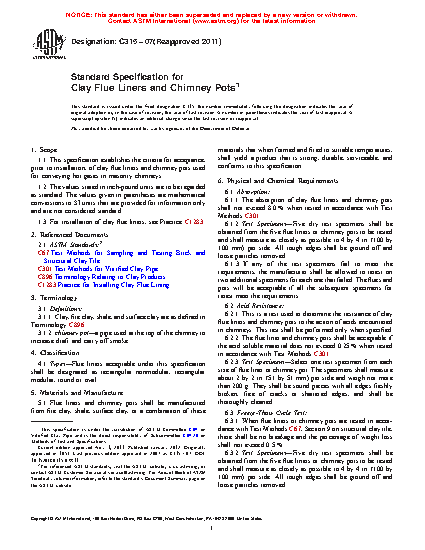1.1 This specification establishes the criteria for acceptance, prior to installation, of clay flue liners and chimney pots used for conveying hot gases in masonry chimneys.