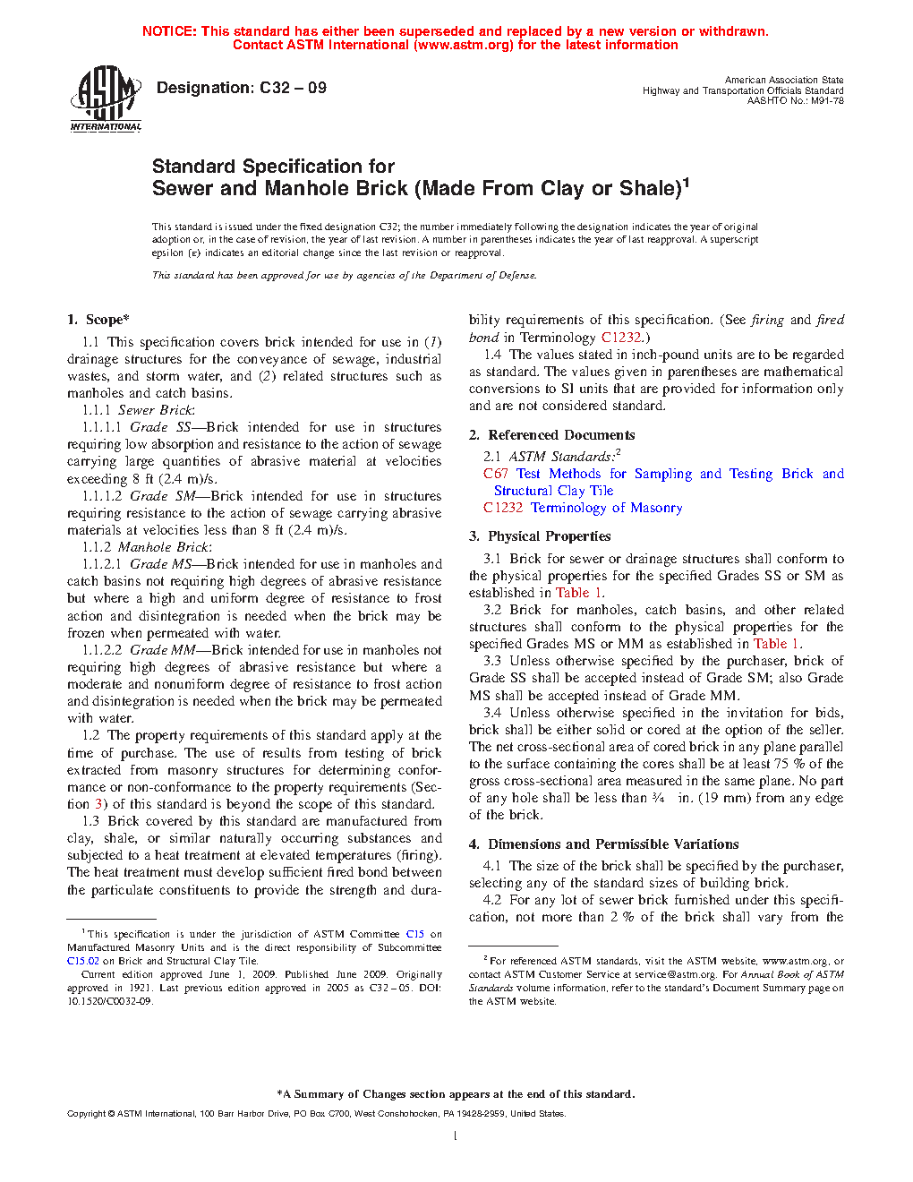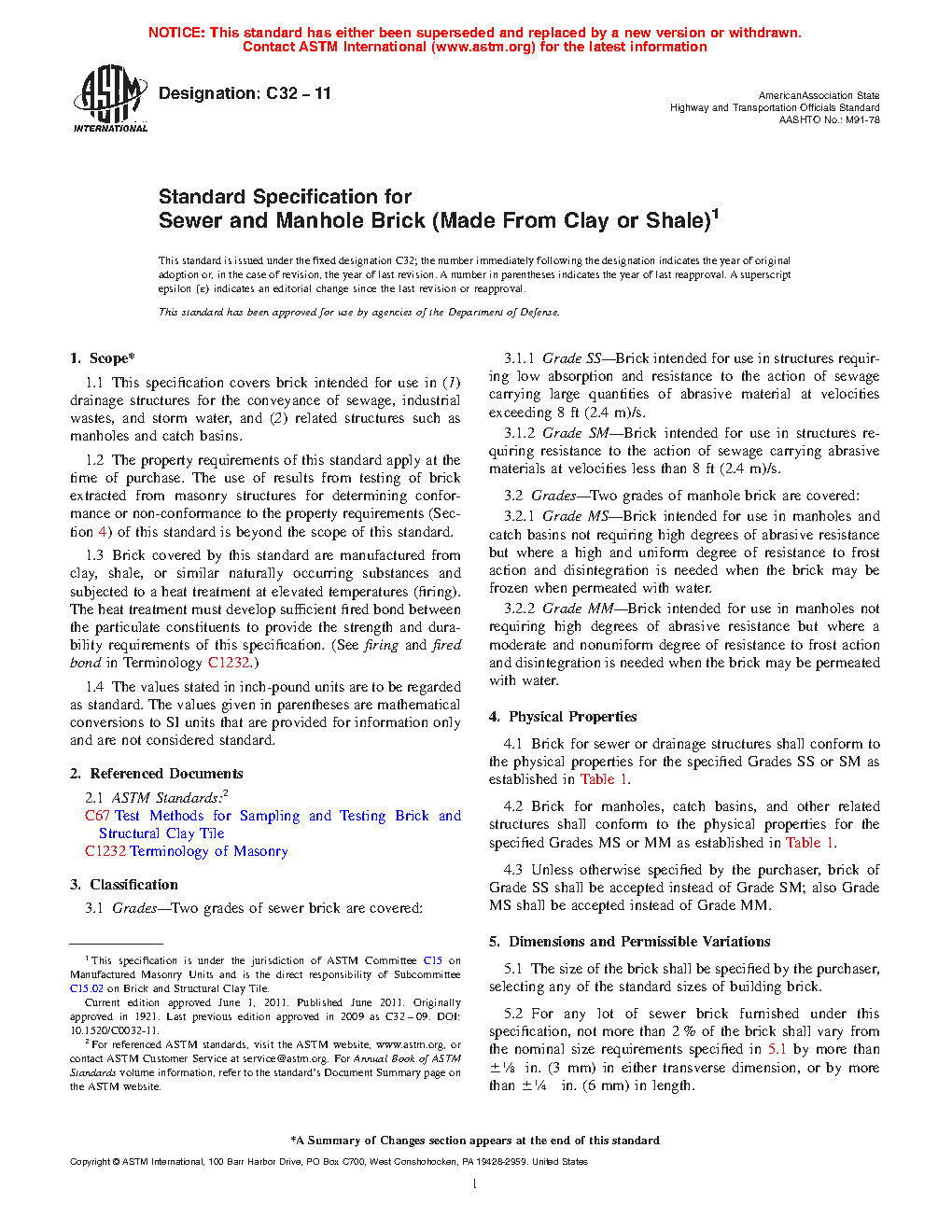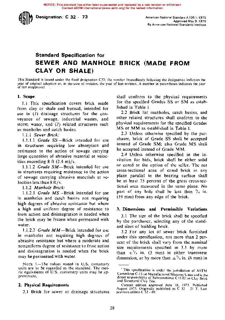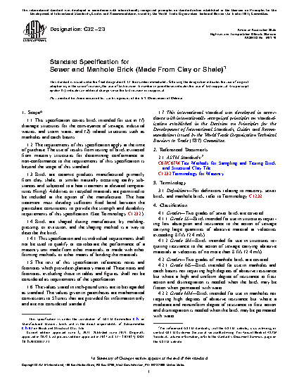 1.1 This specification covers brick intended for use in (1) drainage structures for the conveyance of sewage, industrial wastes, and storm water, and (2) related structures such as manholes and catch basins.