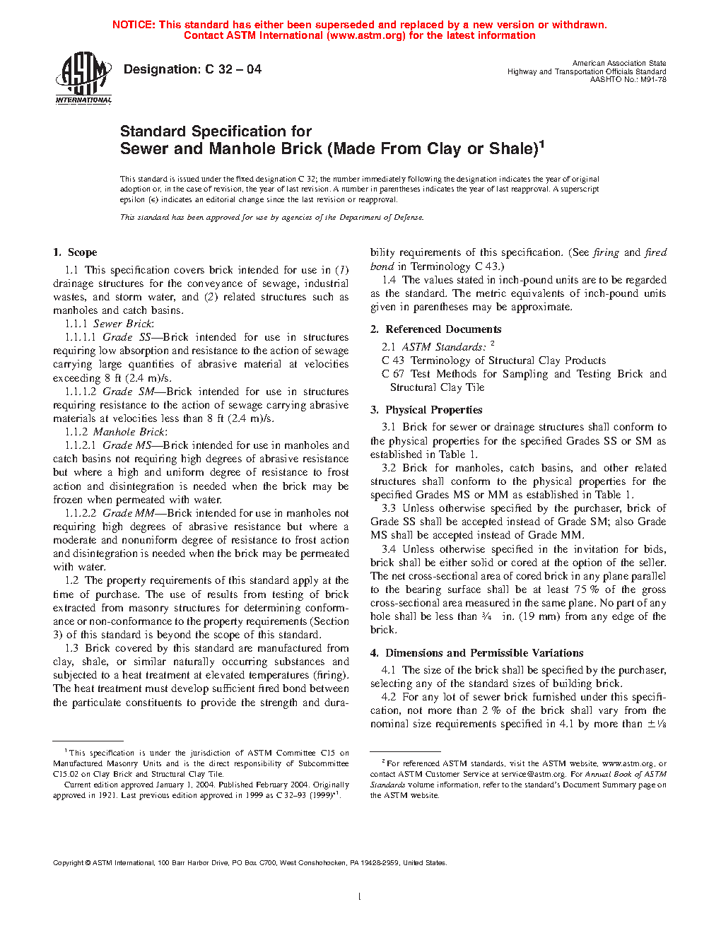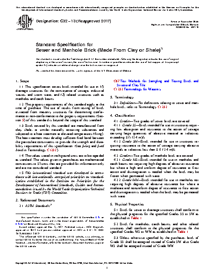 1.1 This specification covers brick intended for use in (1) drainage structures for the conveyance of sewage, industrial wastes, and storm water, and (2) related structures such as manholes and catch basins.