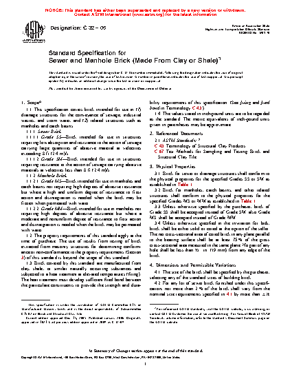 This specification covers brick intended for use in drainage structures for the conveyance of sewage, industrial wastes, and storm water, and related structures such as manholes and catch basins. The bricks are classified as sewer bricks (Grades SS and SM) and manhole bricks (Grades MS and MM). Sewer brick shall have plain or smooth surfaces on both ends and on the face side. Manhole brick shall have plain, slightly, or moderately textured surfaces. The brick shall be sampled and tested in accordance with applicable requirements specified.