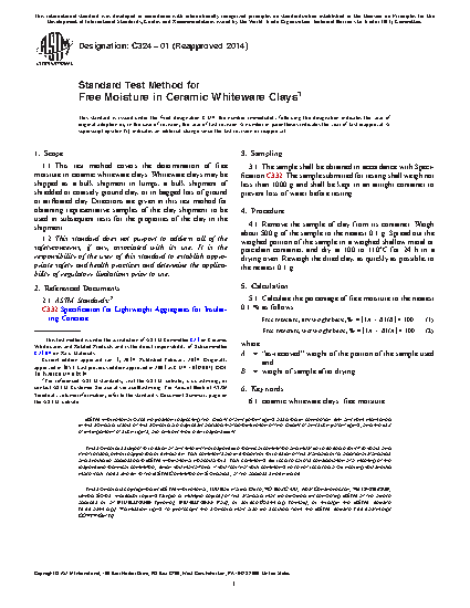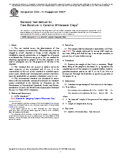 1.1 This test method covers the determination of free moisture in ceramic whiteware clays. Whiteware clays may be shipped as a bulk shipment in lumps, a bulk shipment of shredded or coarsely ground clay, or in bagged lots of ground or airfloated clay. Directions are given in this test method for obtaining representative samples of the clay shipment to be used in subsequent tests for the properties of the clay in the shipment.