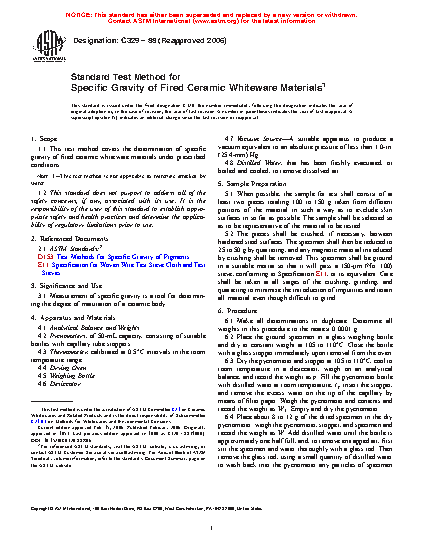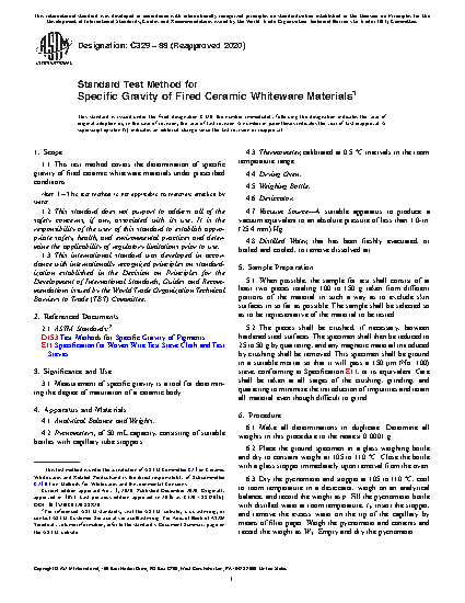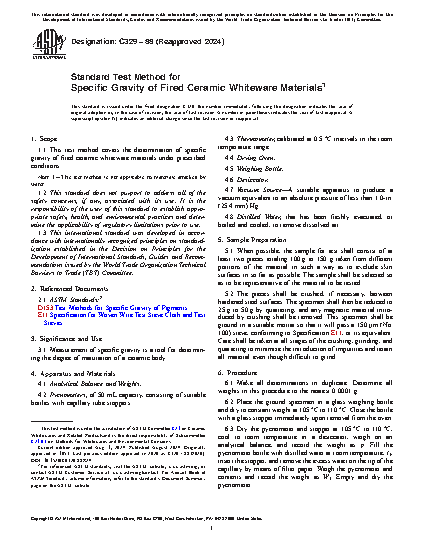1.1 This test method covers the determination of specific gravity of fired ceramic whiteware materials under prescribed conditions.