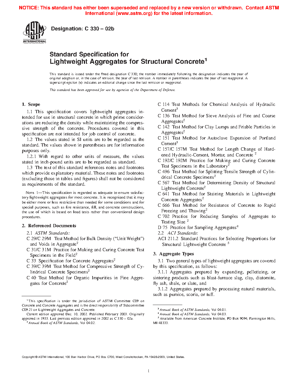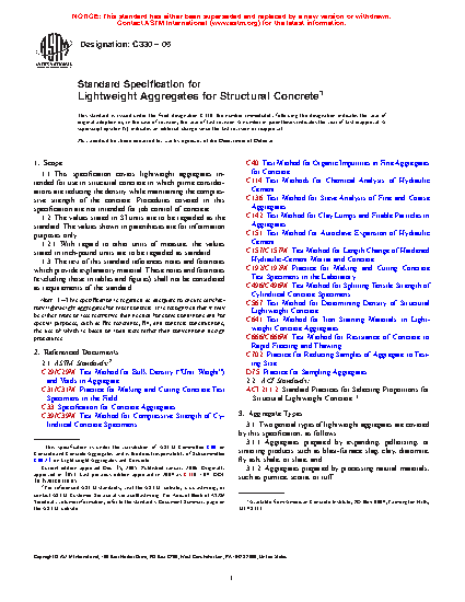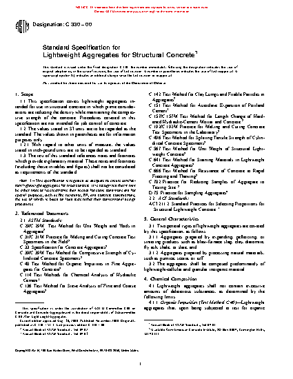 Note 1—This specification is regarded as adequate to ensure satisfactory lightweight aggregates for most concrete. It is recognized that it may be either more or less restrictive than needed for some conditions and for special purposes, such as fire resistance, fill, and concrete constructions, the use of which is based on load tests rather than conventional design procedures.