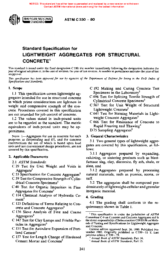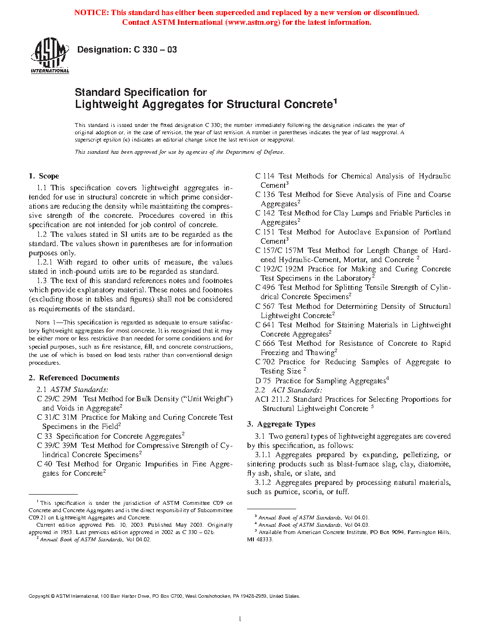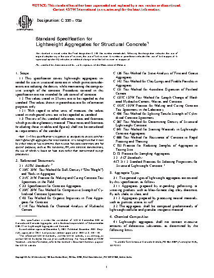 Note 1—This specification is regarded as adequate to ensure satisfactory lightweight aggregates for most concrete. It is recognized that it may be either more or less restrictive than needed for some conditions and for special purposes, such as fire resistance, fill, and concrete constructions, the use of which is based on load tests rather than conventional design procedures.