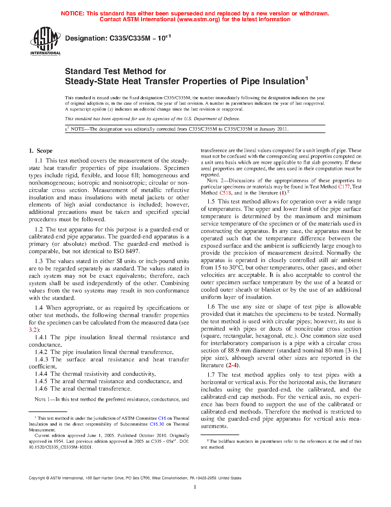 1.2 The test apparatus for this purpose is a guarded-end or calibrated-end pipe apparatus. The guarded-end apparatus is a primary (or absolute) method. The guarded-end method is comparable, but not identical to ISO 8497. The ISO method does not use the calculation procedure in Practice C1045.
