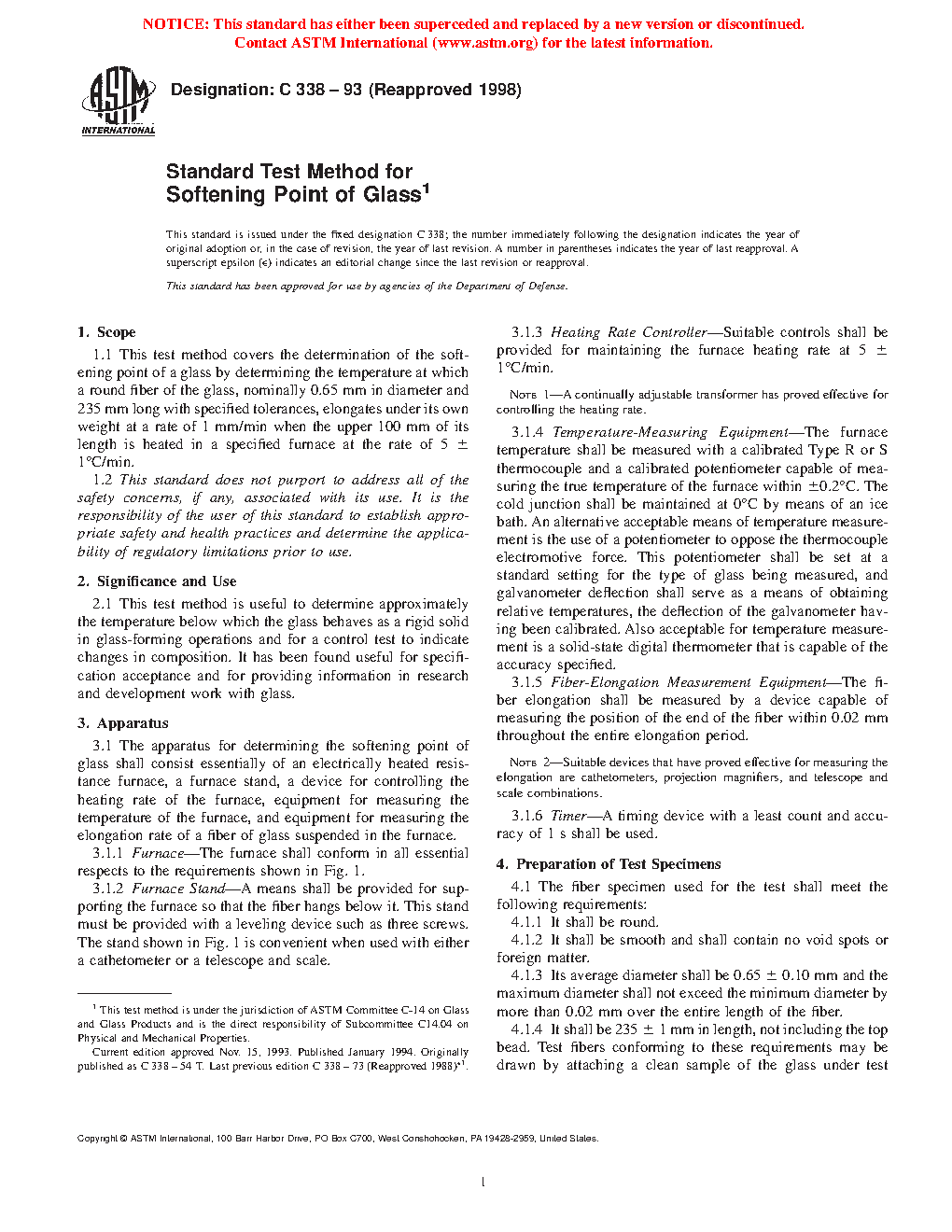 1.1 This test method covers the determination of the softening point of a glass by determining the temperature at which a round fiber of the glass, nominally 0.65 mm in diameter and 235 mm long with specified tolerances, elongates under its own weight at a rate of 1 mm/min when the upper 100 mm of its length is heated in a specified furnace at the rate of 5 ± 1°C/min.