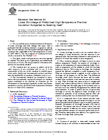 1.1 This test method covers the determination of the amount of linear shrinkage and other changes that occur when a preformed thermal insulating material is exposed to soaking heat. This test method is limited to preformed high-temperature insulation that is applicable to hot-side temperatures in excess of 150°F (66°C), with the exception of insulating fire brick which is covered by Test Method C210.