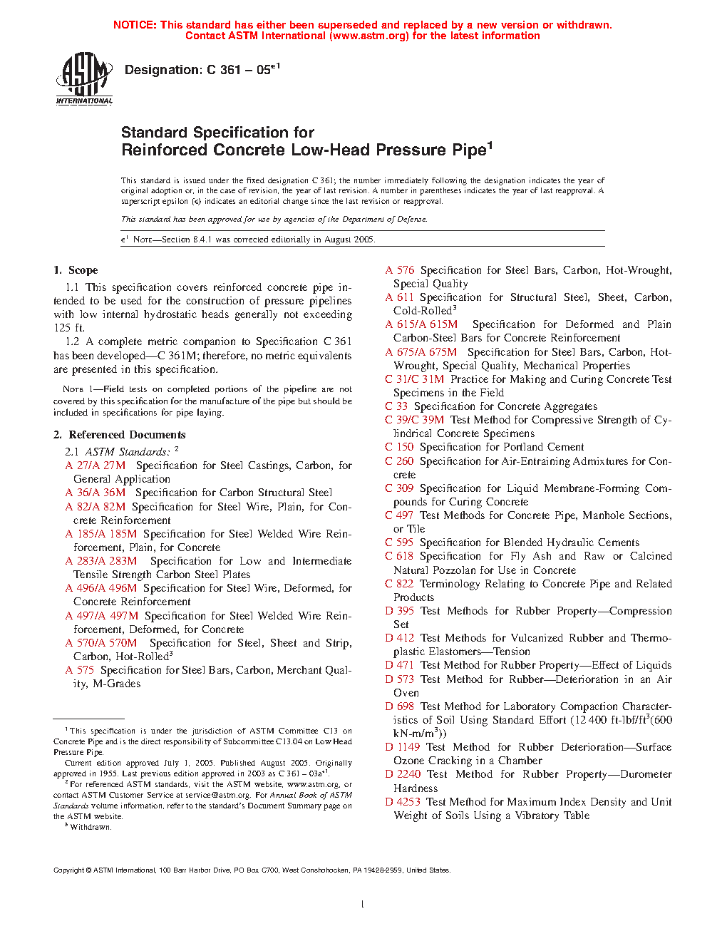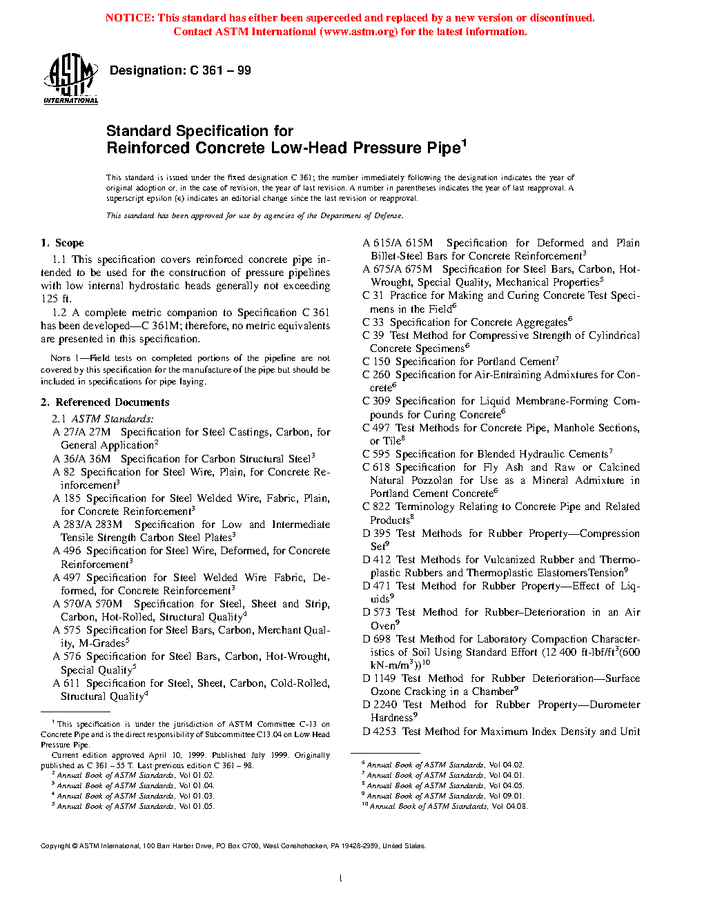 1.1 This specification covers reinforced concrete pipe intended to be used for the construction of pressure pipelines with low internal hydrostatic heads generally not exceeding 125 ft.