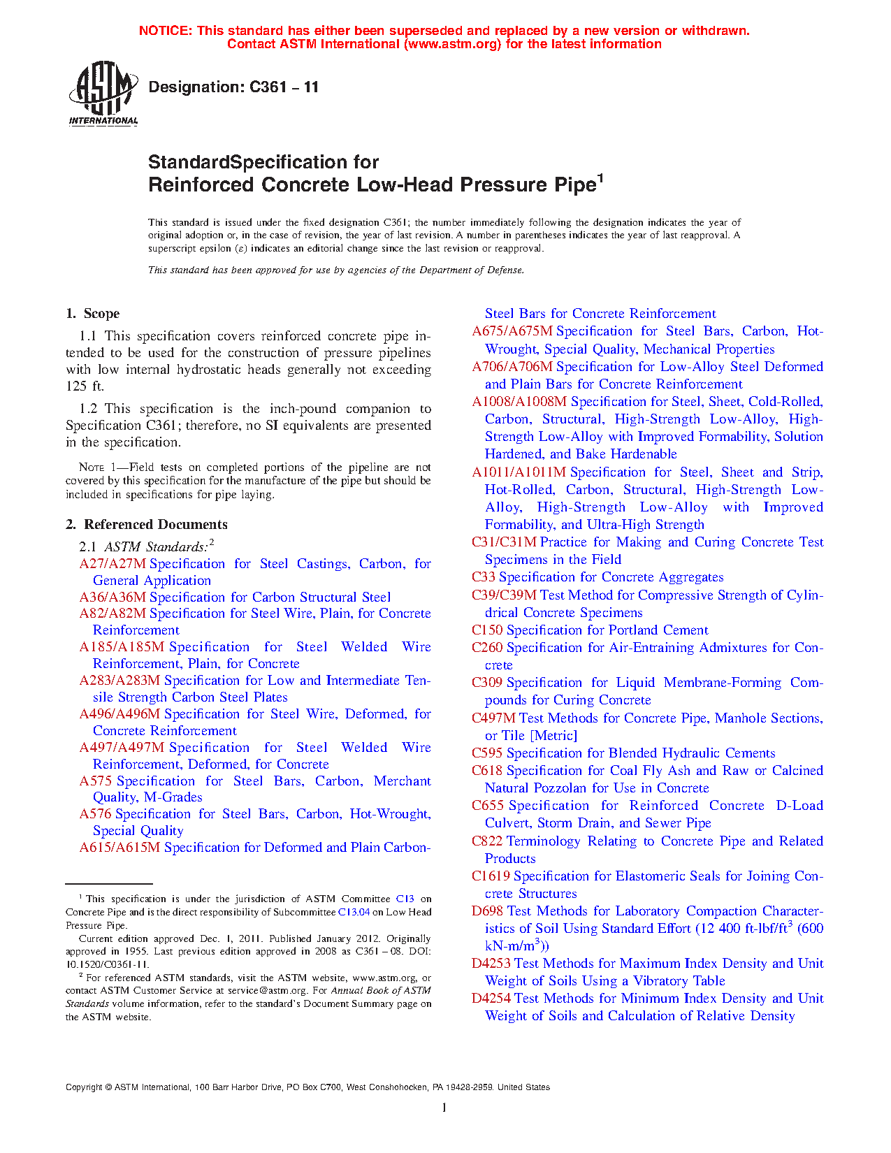 1.1 This specification covers reinforced concrete pipe intended to be used for the construction of pressure pipelines with low internal hydrostatic heads generally not exceeding 125 ft.