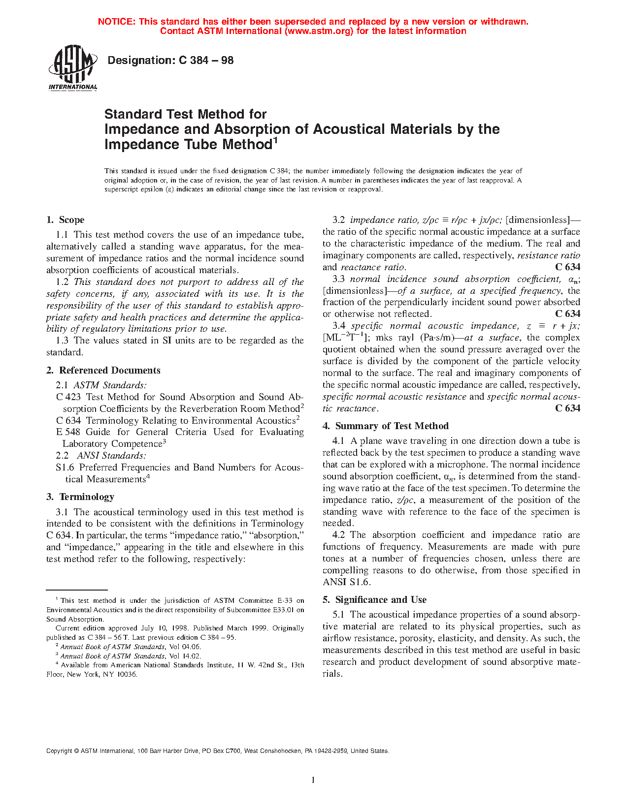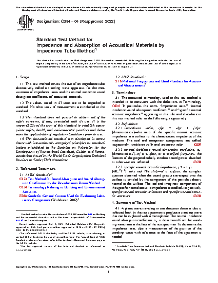 1.1 This test method covers the use of an impedance tube, alternatively called a standing wave apparatus, for the measurement of impedance ratios and the normal incidence sound absorption coefficients of acoustical materials.