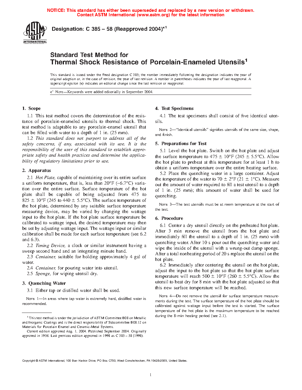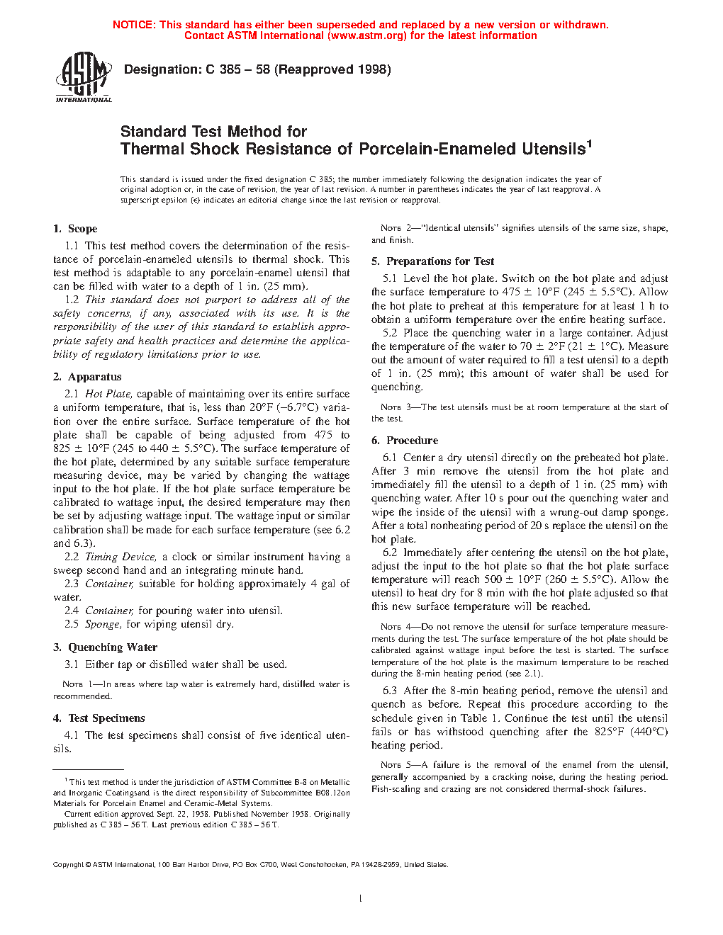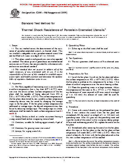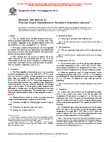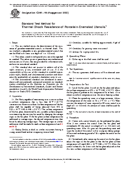 1.1 This test method covers the determination of the resistance of porcelain-enameled utensils to thermal shock. This test method is adaptable to any porcelain-enamel utensil that can be filled with water to a depth of 1 in. (25 mm).