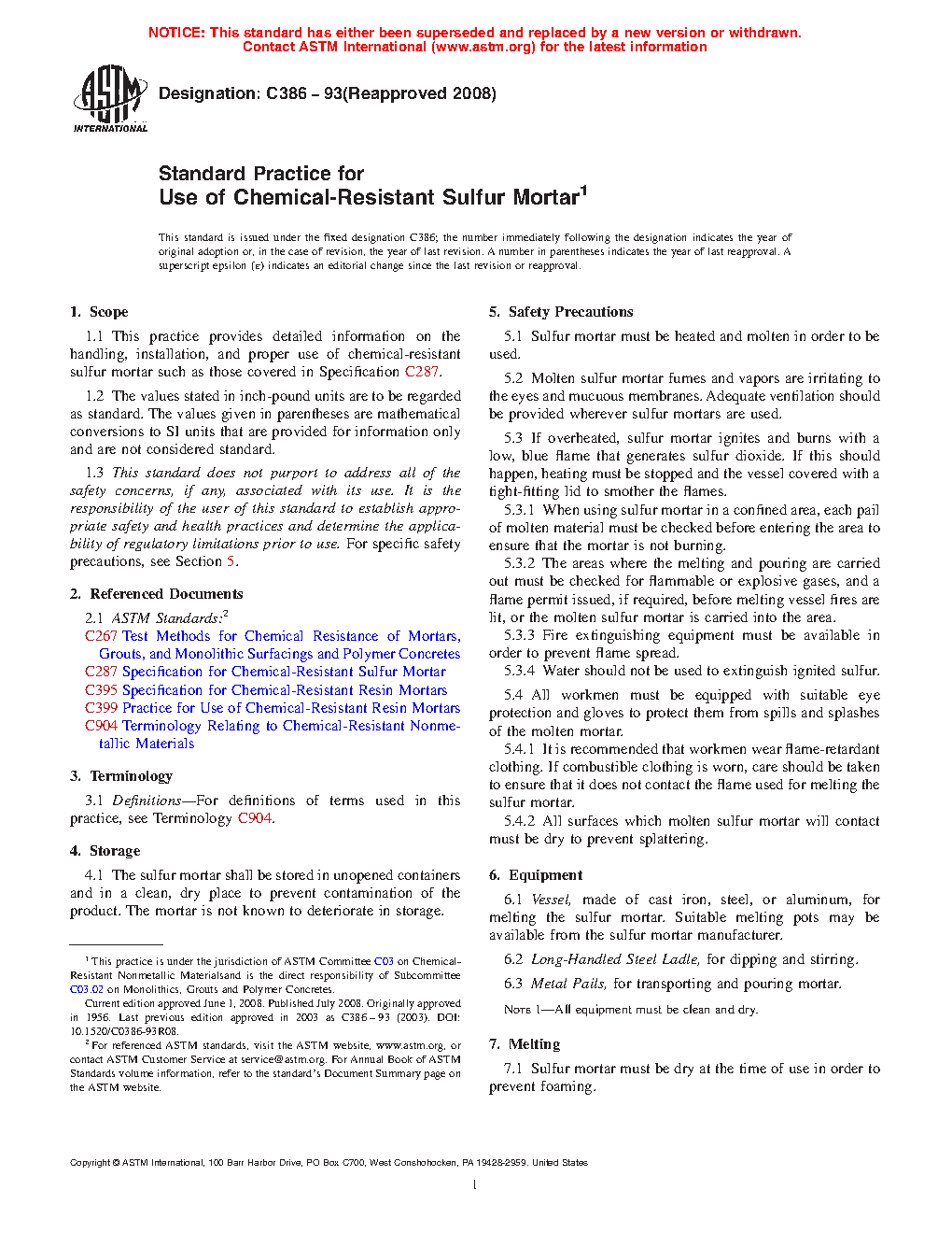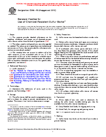 1.1 This practice provides detailed information on the handling, installation, and proper use of chemical-resistant sulfur mortar such as those covered in Specification C287.