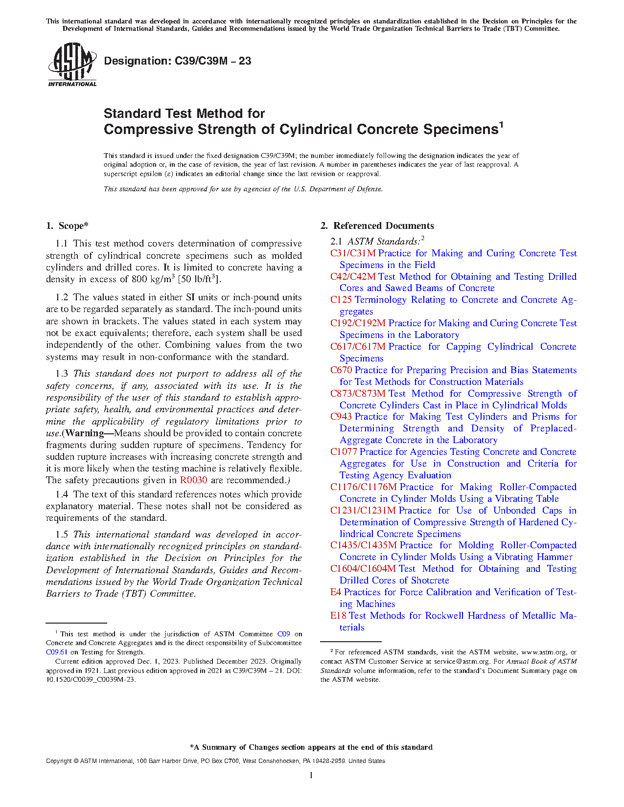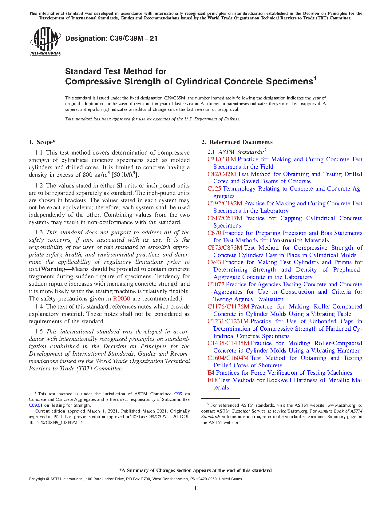 This test method is used to determine compressive strength of cylindrical specimens prepared and cured in accordance with Practices C31/C31M, C192/C192M, C617, and C1231/C1231M and Test Methods C42/C42M and C873.
