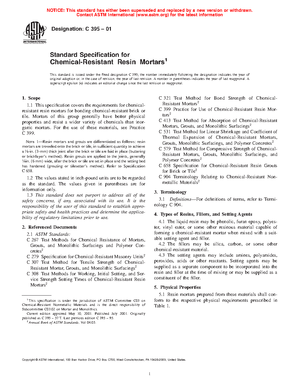 This specification covers the requirements for chemical-resistant resin mortars for bonding chemical-resistant brick or tile. Mortars of this group generally have better physical properties and resist a wider variety of chemicals than inorganic mortars. The liquid resin may be phenolic, furan epoxy, polyester, vinyl ester, or some other resinous material capable of forming a chemical-resistant mortar when mixed with a suitable setting agent and filler. The fillers may be silica, carbon, or some other chemical-resistant material. The setting agents may include amines, polyamides, peroxides, acids or other reactants. Setting agents may be supplied as a separate component to be incorporated into the resin and filler at the time of mixing or may be supplied as a constituent of the filler. The resin shall be tested and should conform to the specified values of viscosity, chemical resistance, working life and setting time, tensile strength, compressive strength, bond strength, shrinkage, and absorption.