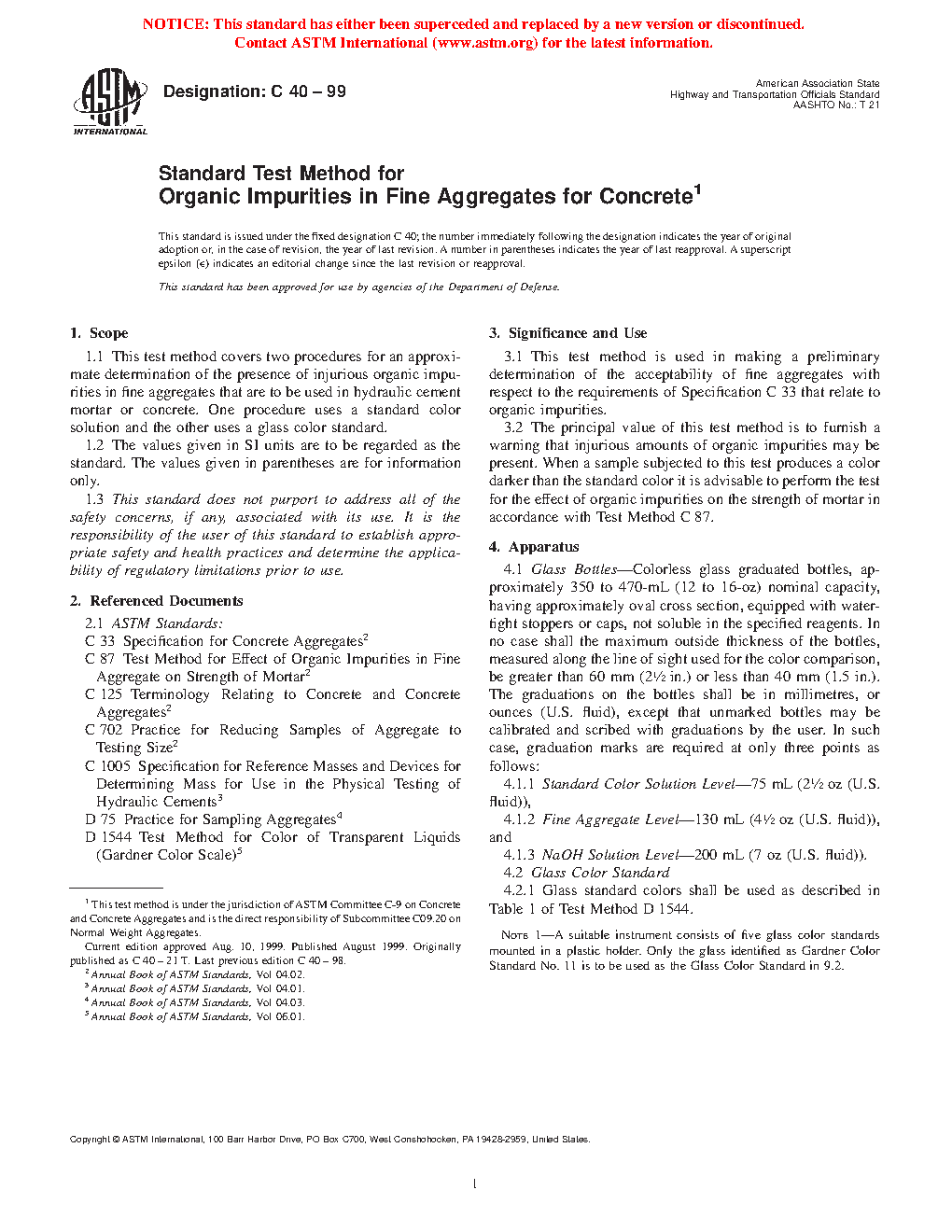 1.1 This test method covers two procedures for an approximate determination of the presence of injurious organic impurities in fine aggregates that are to be used in hydraulic cement mortar or concrete. One procedure uses a standard color solution and the other uses a glass color standard.