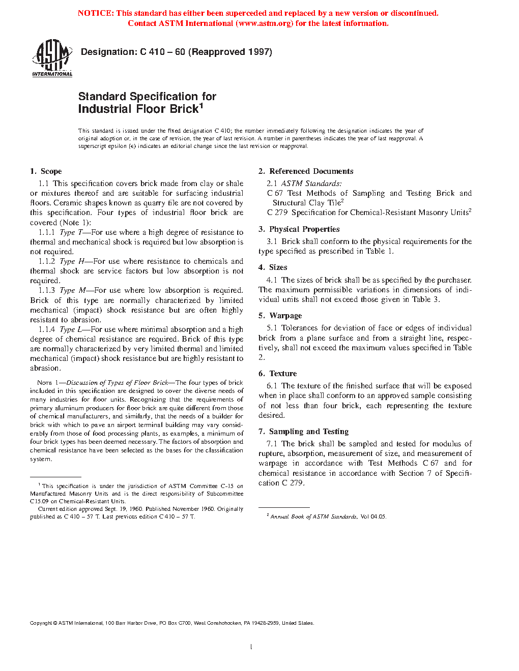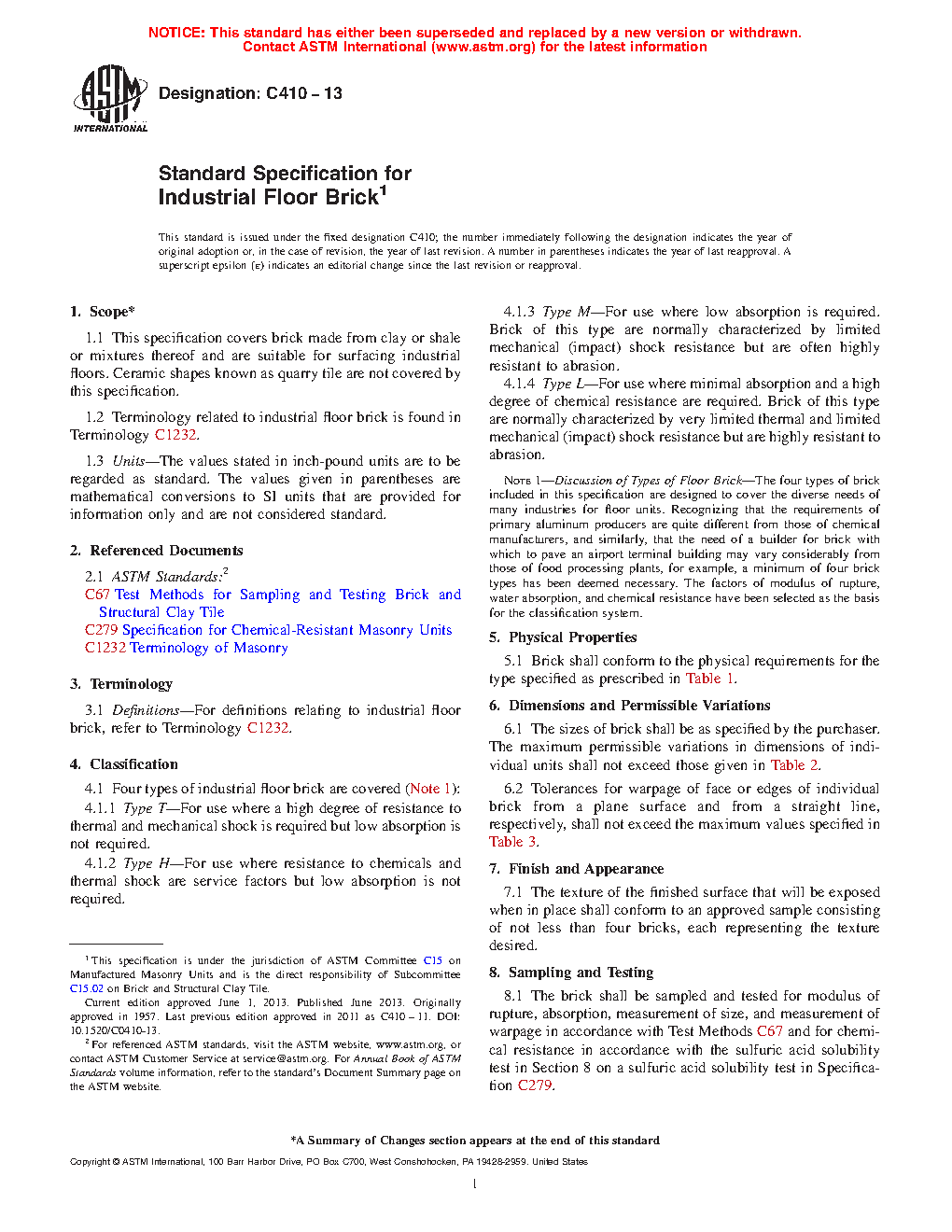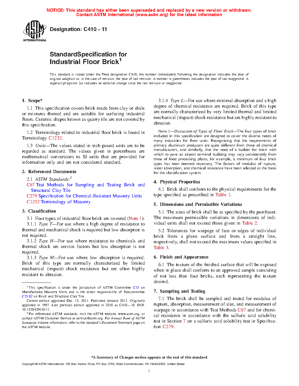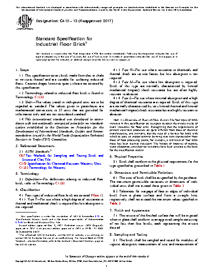 This specification covers brick made from clay or shale or mixtures thereof and are suitable for surfacing industrial floors. Four types of industrial floor bricks are covered: Types T, H, M, and L. Brick shall conform to the physical requirements for the type specified. Tolerances for deviation of face or edges of individual brick from a plane surface and from a straight line, respectively, shall not exceed the maximum values specified. The brick shall be sampled and tested for modulus of rupture, absorption, measurement of size, and measurement of warpage in accordance with the requirements specified and for chemical resistance in accordance with the sulfuric acid solubility test specified.