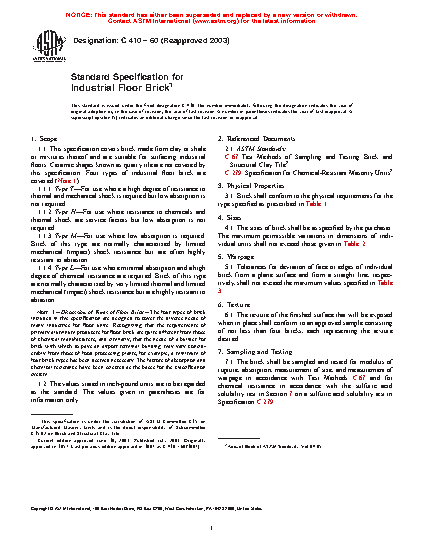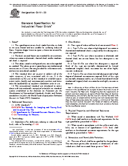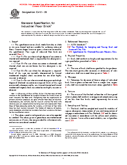 1.1 This specification covers brick made from clay or shale or mixtures thereof and are suitable for surfacing industrial floors. Ceramic shapes known as quarry tile are not covered by this specification.