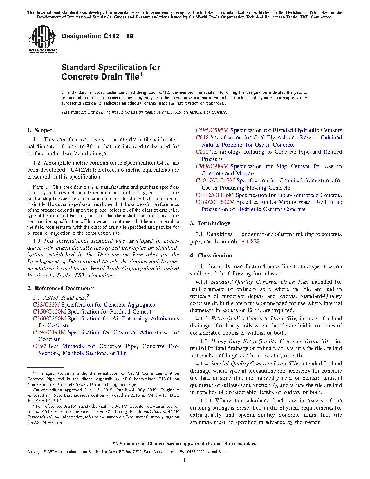 This specification covers concrete drain tile, to be used for surface and subsurface drainage. Manufactured drain tile shall be of the following classes: standard-quality concrete drain tile, extra-quality concrete drain tile, heavy-duty extra-quality concrete drain tile, and special-quality concrete drain tile. The concrete shall consist of mineral aggregates, water, and cementitious materials that include Portland cement, fly ash, ground granulated blast furnace slag, aggregates, admixtures and blends, and synthetic fibers. Concrete drain tile shall meet the physical requirement of the specification according to class, depending on soil acidity and sulfate content. Test specimens shall meet the external load crushing strength test requirement of the specification.