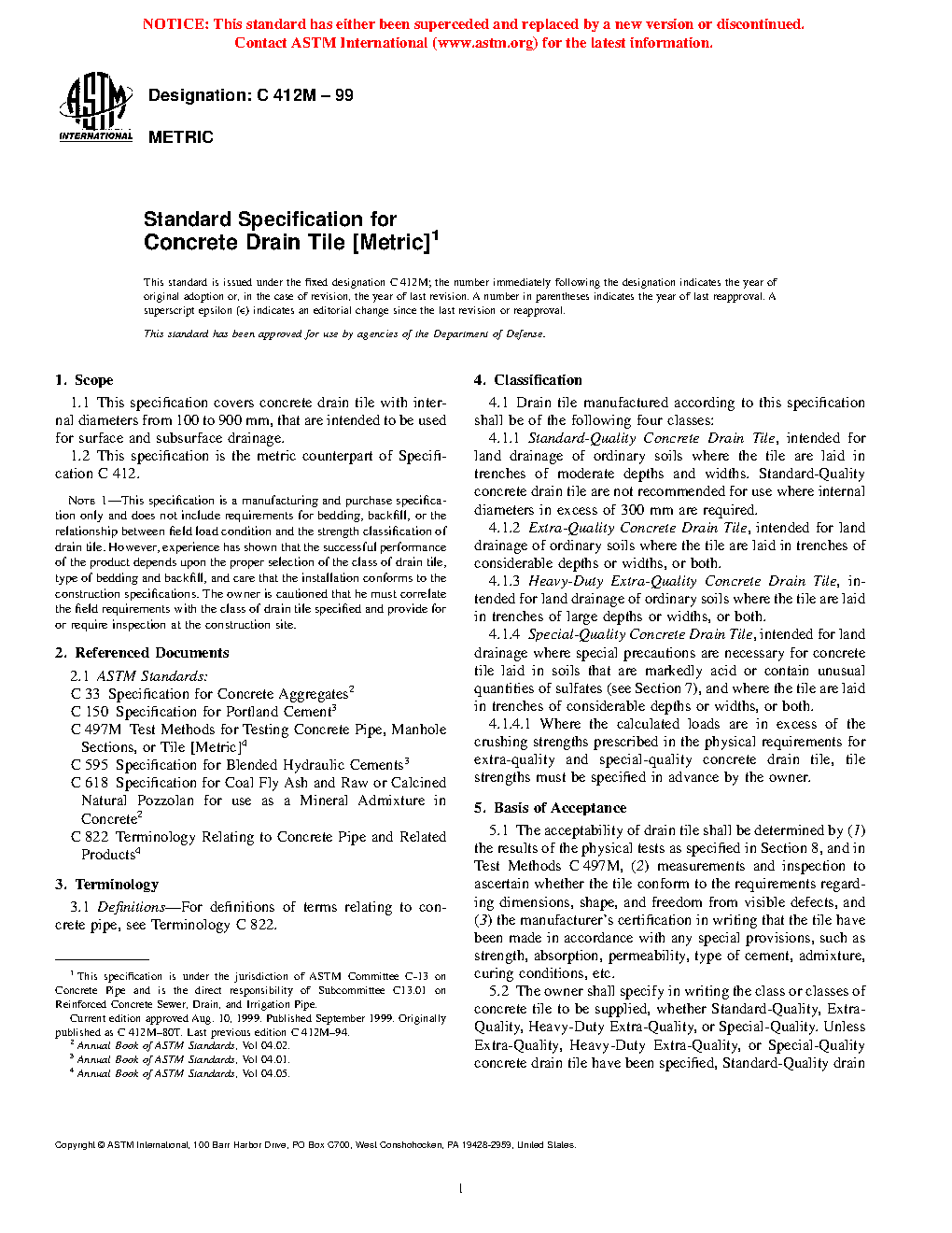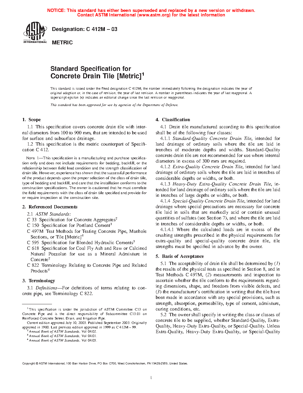 Note 1-This specification is a manufacturing and purchase specification only and does not include requirements for bedding, backfill, or the relationship between field load condition and the strength classification of drain tile. However, experience has shown that the successful performance of the product depends upon the proper selection of the class of drain tile, type of bedding and backfill, and care that the installation conforms to the construction specifications. The owner is cautioned that he must correlate the field requirements with the class of drain tile specified and provide for or require inspection at the construction site.Technical characteristics
