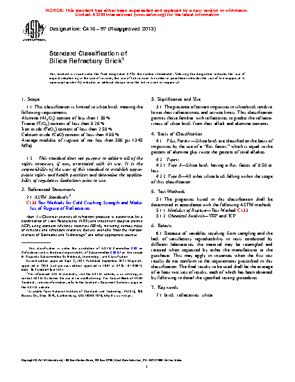 3.1 The presence of certain impurities in silica brick tends to lower their refractoriness and service limits. This classification permits those familiar with refractories to predict the refractoriness of silica brick from their alkali and alumina contents.