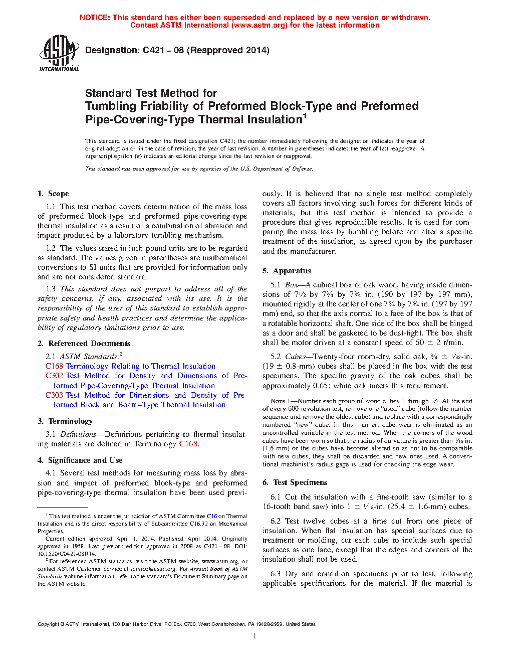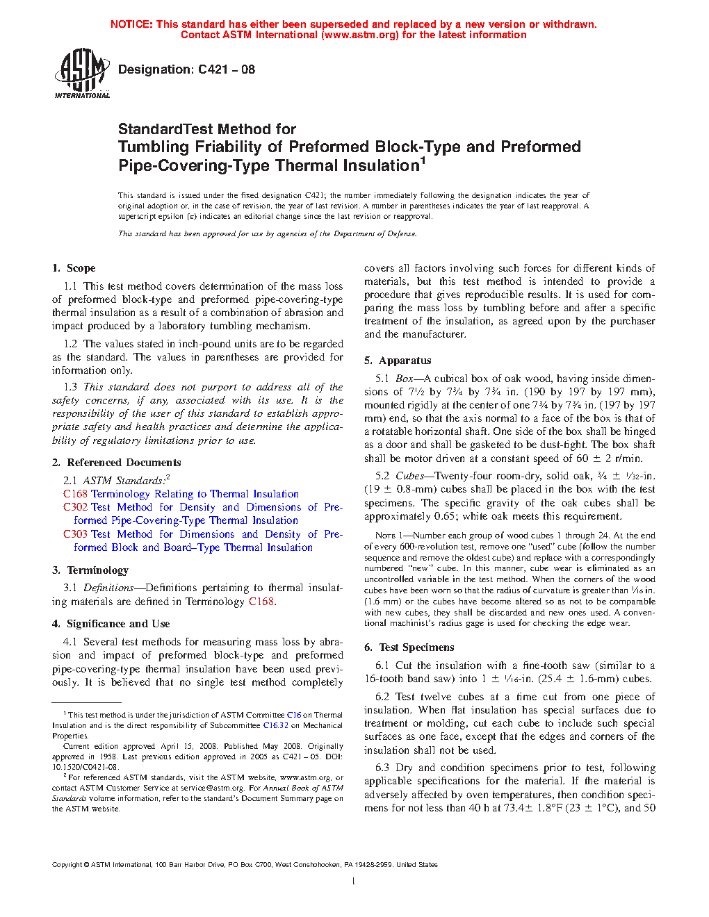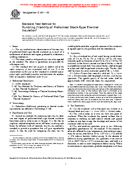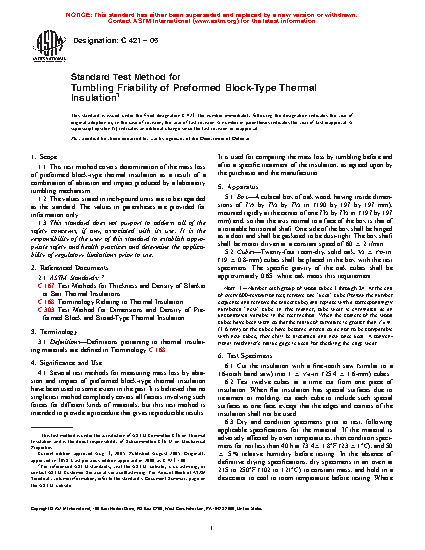 1.1 This test method covers determination of the mass loss of preformed block-type and preformed pipe-covering-type thermal insulation as a result of a combination of abrasion and impact produced by a laboratory tumbling mechanism.