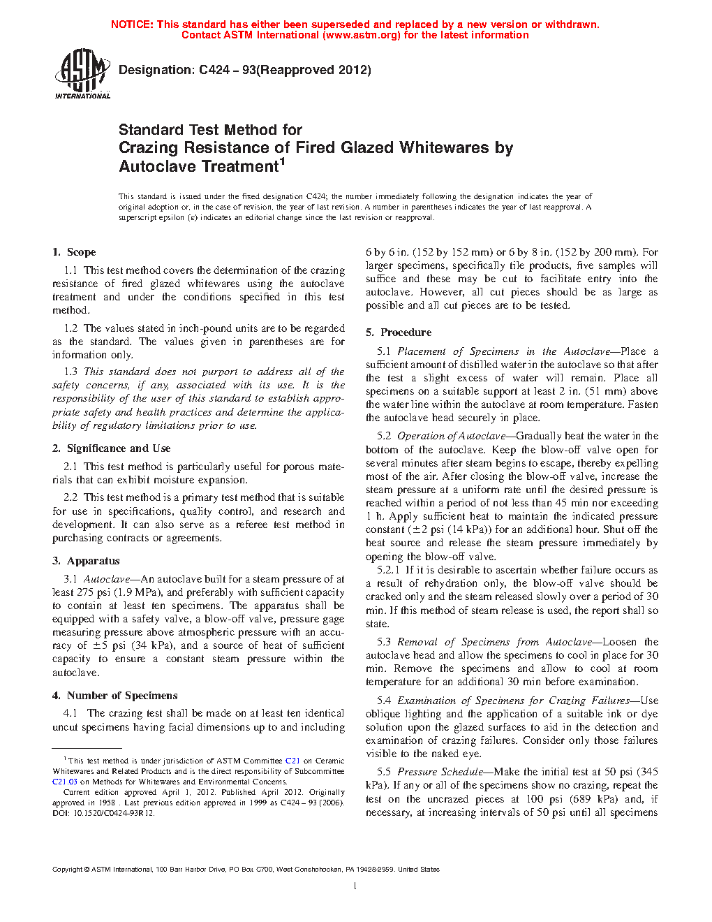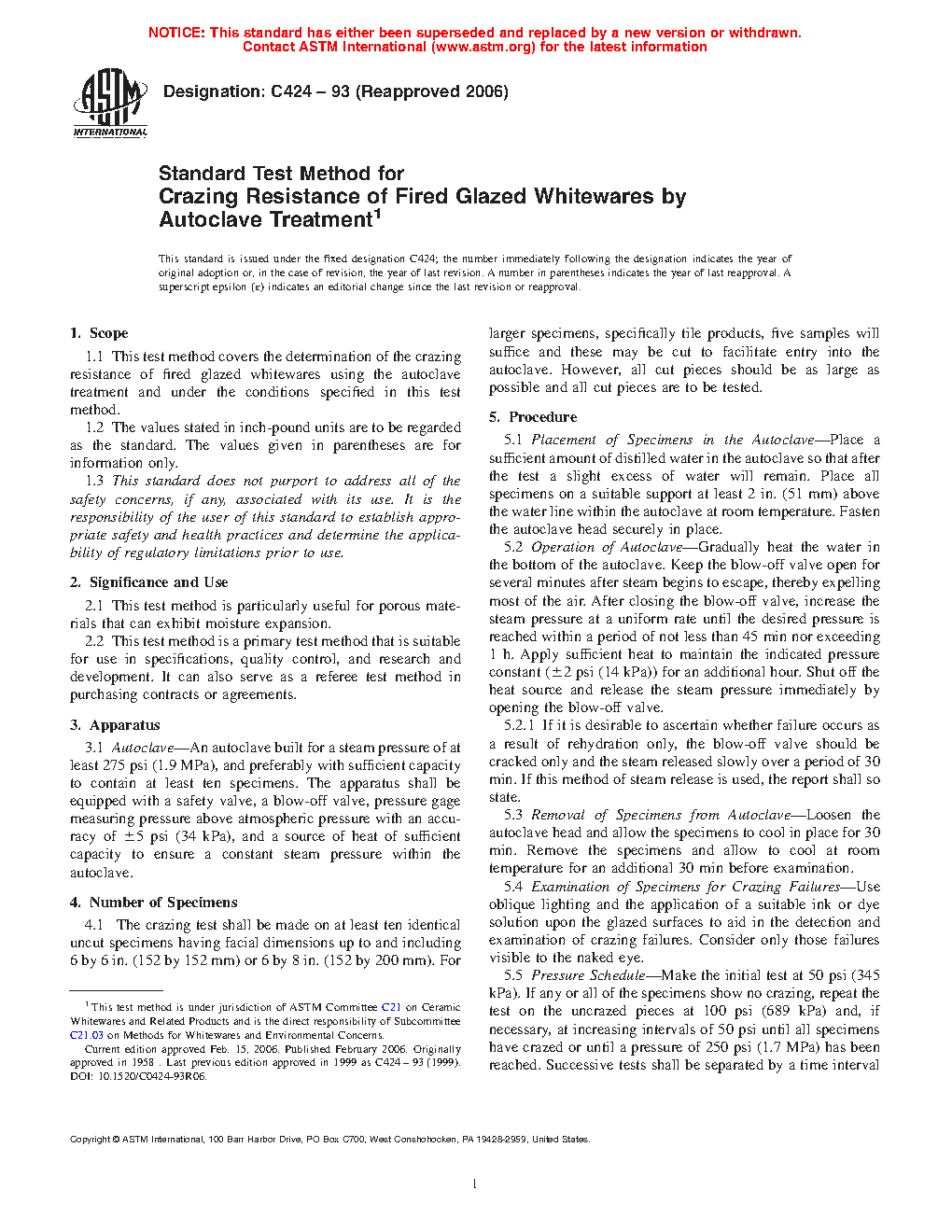 1.1 This test method covers the determination of the crazing resistance of fired glazed whitewares using the autoclave treatment and under the conditions specified in this test method.