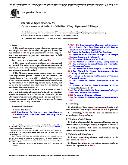1.1 This specification covers materials and test requirements for compression joints for vitrified clay pipe and fittings. See Specification C 700 for pipe specifications. The test requirements are applicable to pipe joint assemblies prior to field installation of pipe.