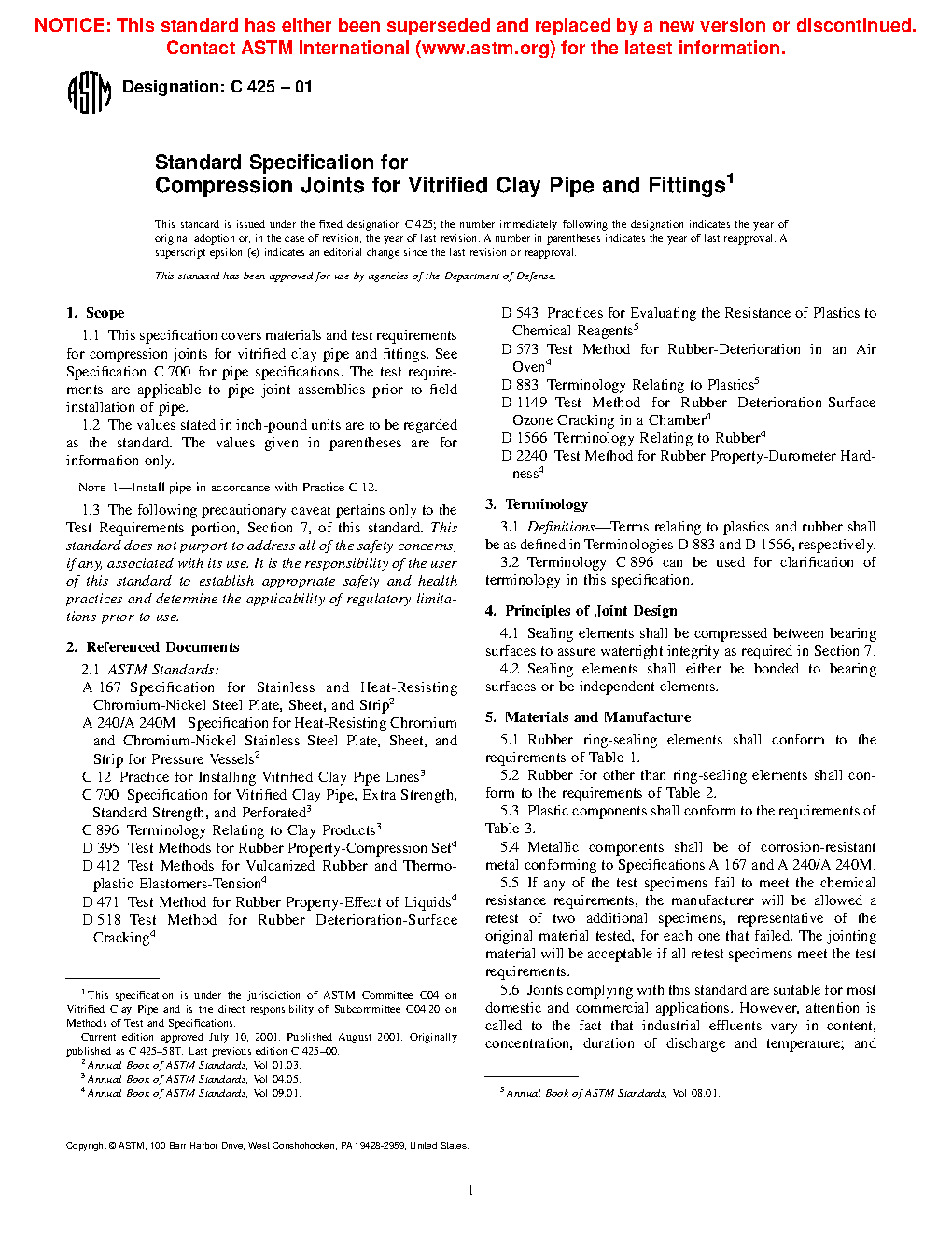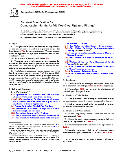 This specification covers vitrified clay pipe and fitting materials and pipe joint assemblies test requirements for compression joints. Sealing elements shall be compressed and bounded between bearing surfaces to assure watertight integrity. Materials and manufacture, such as rubber ring-sealing elements, plastic components, and metallic components, shall conform to the chemical resistance, tensile strength, hardness, compression set, water absorption, ozone resistance, and accelerated oven aging requirements of the specification. Minimum of two assembled joints shall be tested for each diameter of pipe furnished. Joints shall be subjected to water pressure testing and shall not leak even when deflected, displaced or subjected to shear under the limits indicated in the specification.