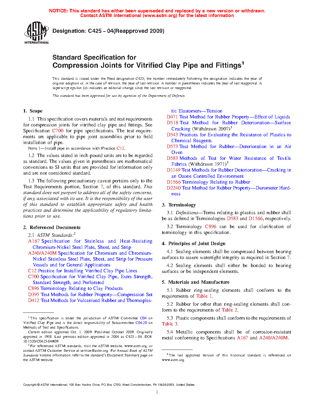 1.1 This specification covers materials and test requirements for compression joints for vitrified clay pipe and fittings. See Specification C700 for pipe specifications. The test requirements are applicable to pipe joint assemblies prior to field installation of pipe.