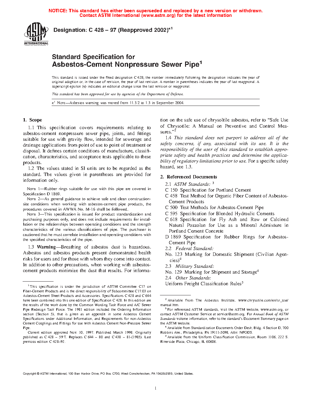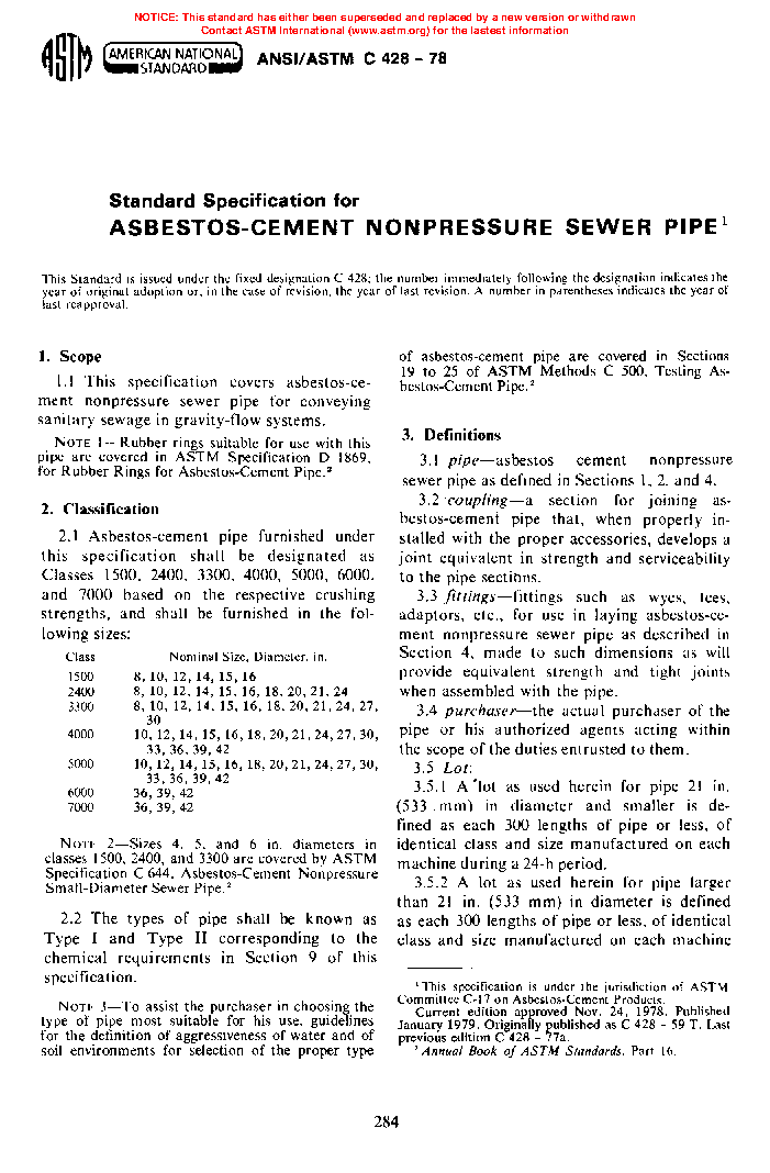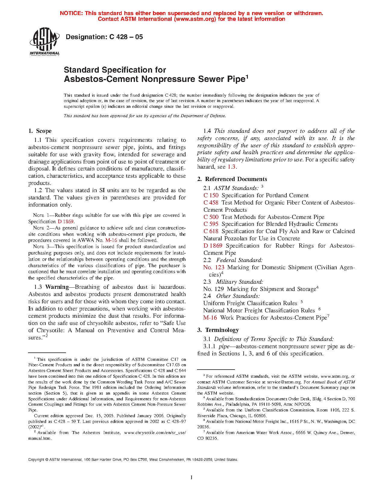 Standard Specification for Asbestos-Cement Nonpressure Sewer Pipe