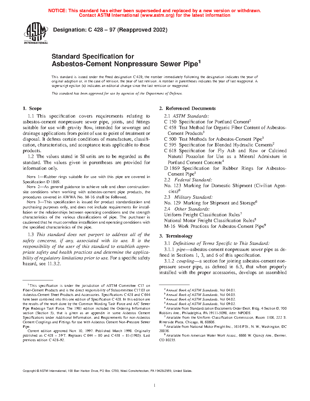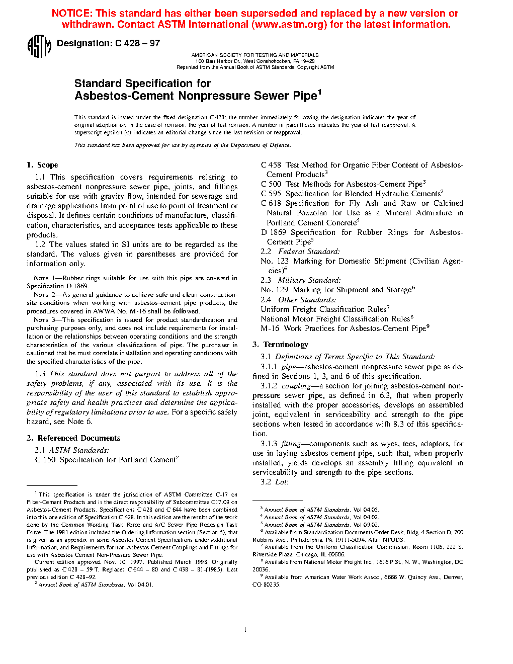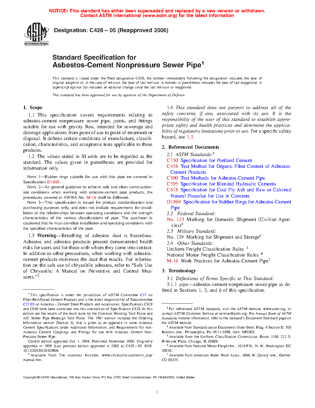 Standard Specification for Asbestos-Cement Nonpressure Sewer Pipe