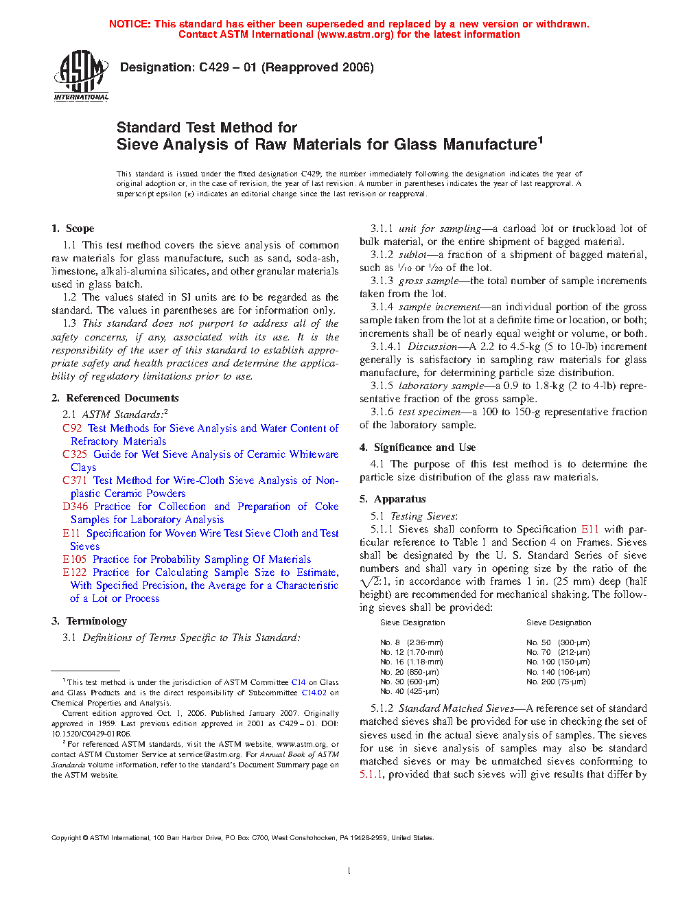 1.1 This test method covers the sieve analysis of common raw materials for glass manufacture, such as sand, soda-ash, limestone, alkali-alumina silicates, and other granular materials used in glass batch.