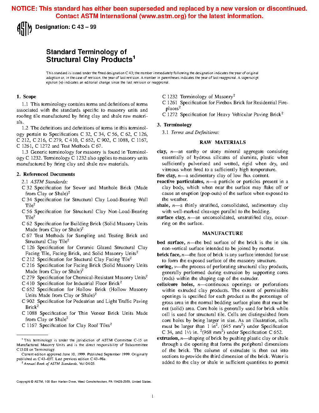 1.3 Generic terminology for masonry is found in Terminology C1232. Terminology C1232 also applies to masonry units manufactured by firing clay and shale raw materials.