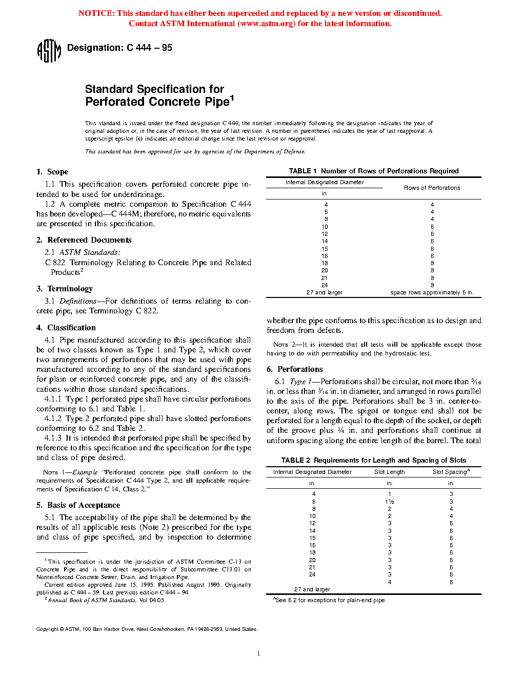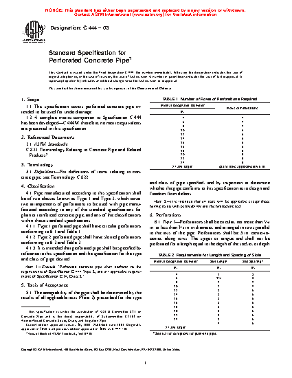 This specification covers perforated concrete pipe intended to be used for underdrainage. Pipe manufactured to this specification shall be of two classes, Type 1 and Type 2, describing two arrangements of perforations for pipe manufactured to the standard specifications for plain or reinforced concrete pipe, and their classifications. The acceptability of the pipe shall be determined by the results of all applicable tests prescribed for the type and class of pipe specified. The joints shall be of such design and the ends of the concrete pipe sections so formed that the pipe can be laid together to make a continuous line of pipe.