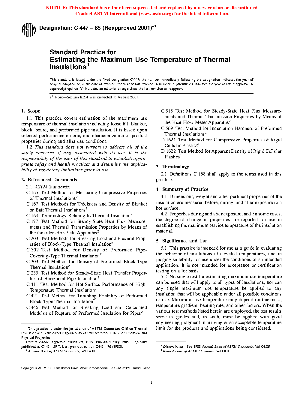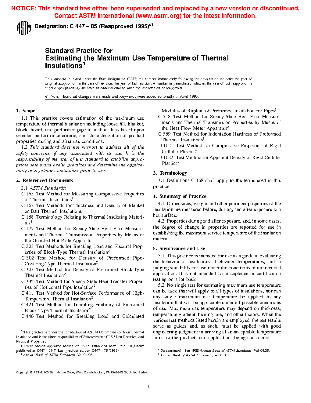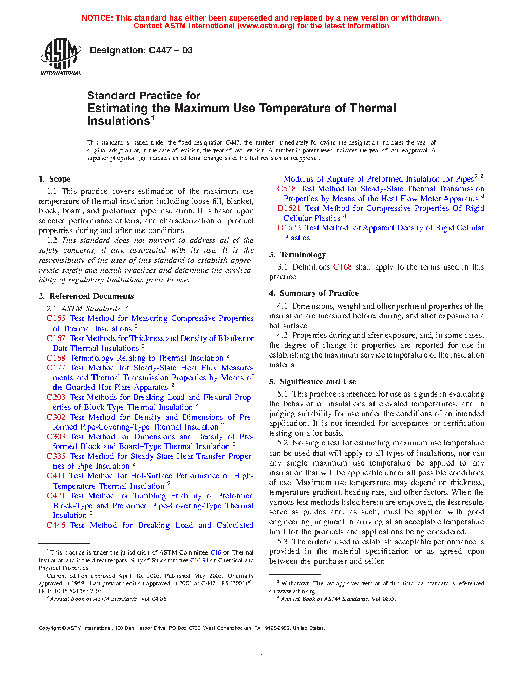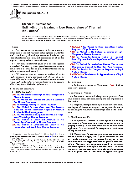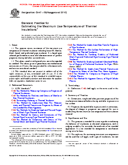 1.1 This practice covers estimation of the maximum use temperature of thermal insulation including loose fill, blanket, block, board, and preformed pipe insulation. It is based upon selected performance criteria, and characterization of product properties during and after use conditions.