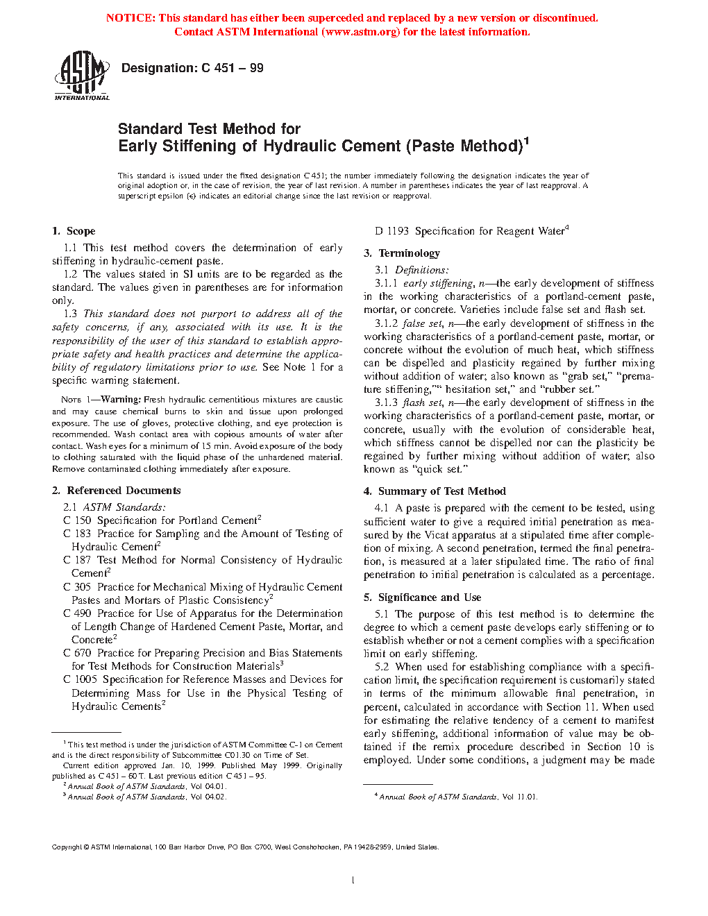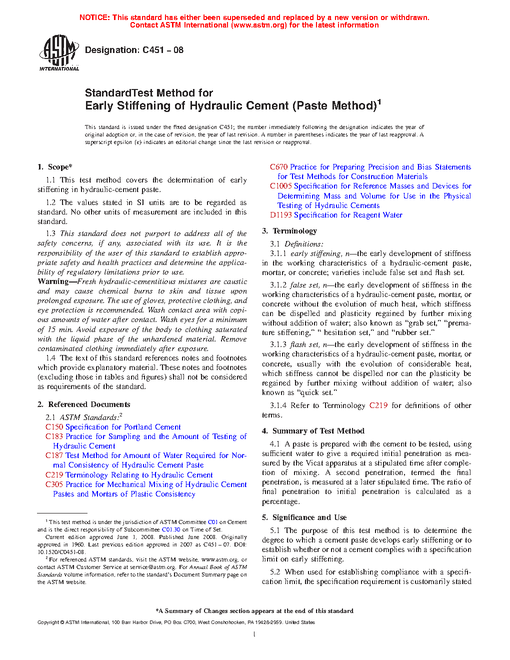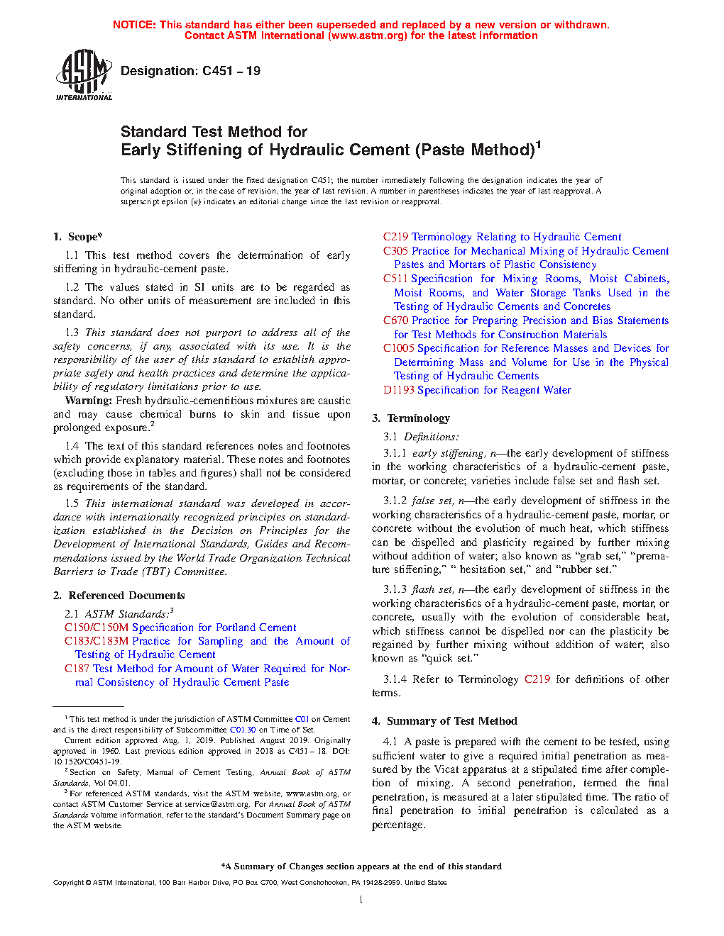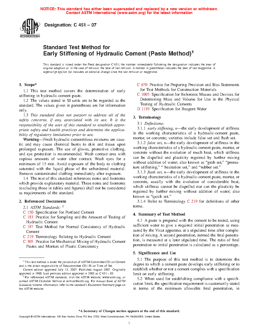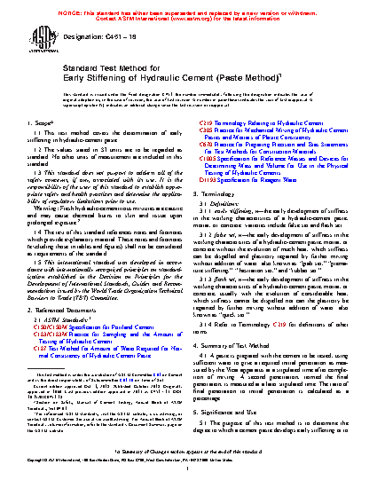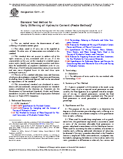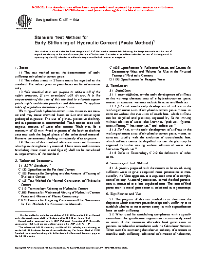 The purpose of this test method is to determine the degree to which a cement paste develops early stiffening or to establish whether or not a cement complies with a specification limit on early stiffening.