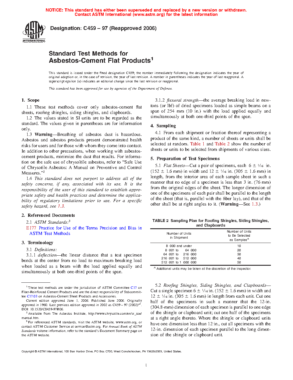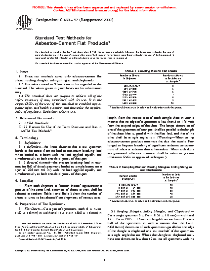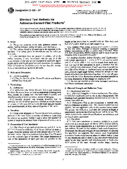 This test method covers asbestos-cement flat sheets, roofing shingles, siding shingles, and clapboards. Each test specimen should be cut to specification without cracks and damage. This test method details the significance and use of routine test procedures for flexural strength, deflection, water absorption, and dimensions.