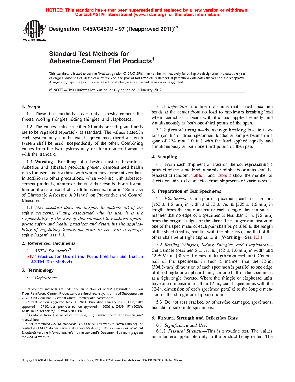 1.3 Warning—Breathing of asbestos dust is hazardous. Asbestos and asbestos products present demonstrated health risks for users and for those with whom they come into contact. In addition to other precautions, when working with asbestos-cement products, minimize the dust that results. For information on the safe use of chrysoltile asbestos, refer to “Safe Use of Chrysotile Asbestos: A Manual on Preventive and Control Measures.”2